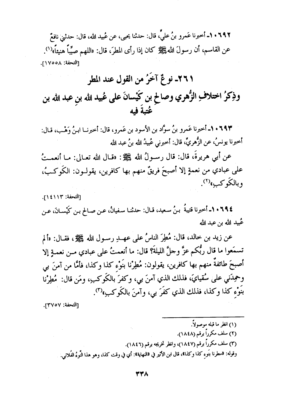 10694 - أَخْبَرَنَا قُتَيْبَةُ بْنُ سَعِيدٍ، قَالَ: حَدَّثَنَا سُفْيَانُ، عَنْ صَالِحِ بْنِ كَيْسَانَ، عَنْ عُبَيْدِ اللهِ بْنِ عَبْدِ اللهِ، عَنْ زَيْدِ بْنِ خَالِدٍ، قَالَ: مُطِرُ النَّاسُ عَلَى عَهْدِ رَسُولِ اللهِ صَلَّى اللهُ عَلَيْهِ وَسَلَّمَ فَقَالَ: " §أَلَمْ تَسْمَعُوا مَا قَالَ رَبُّكُمْ عَزَّ وَجَلَّ اللَّيْلَةَ، قَالَ: مَا أَنْعَمْتُ عَلَى عِبَادِي مِنْ نِعْمَةٍ إِلَّا أَصْبَحَ طَائِفَةٌ مِنْهُمْ بِهَا كَافِرَيْنَ يَقُولُونَ: مُطِرْنَا بِنَوْءِ كَذَا وَكَذَا، فَأَمَّا مَنْ آمَنَ بِي وَحَمِدَنِي عَلَى سُقْيَايَ فَذَلِكَ الَّذِي آمَنَ بِي وَكَفَرَ بِالْكَوْكَبِ، وَمَنْ قَالَ: مُطِرْنَا بِنَوْءِ كَذَا وَكَذَا فَذَلِكَ الَّذِي كَفَرَ بِي وَآمَنَ بِالْكَوْكَبِ "