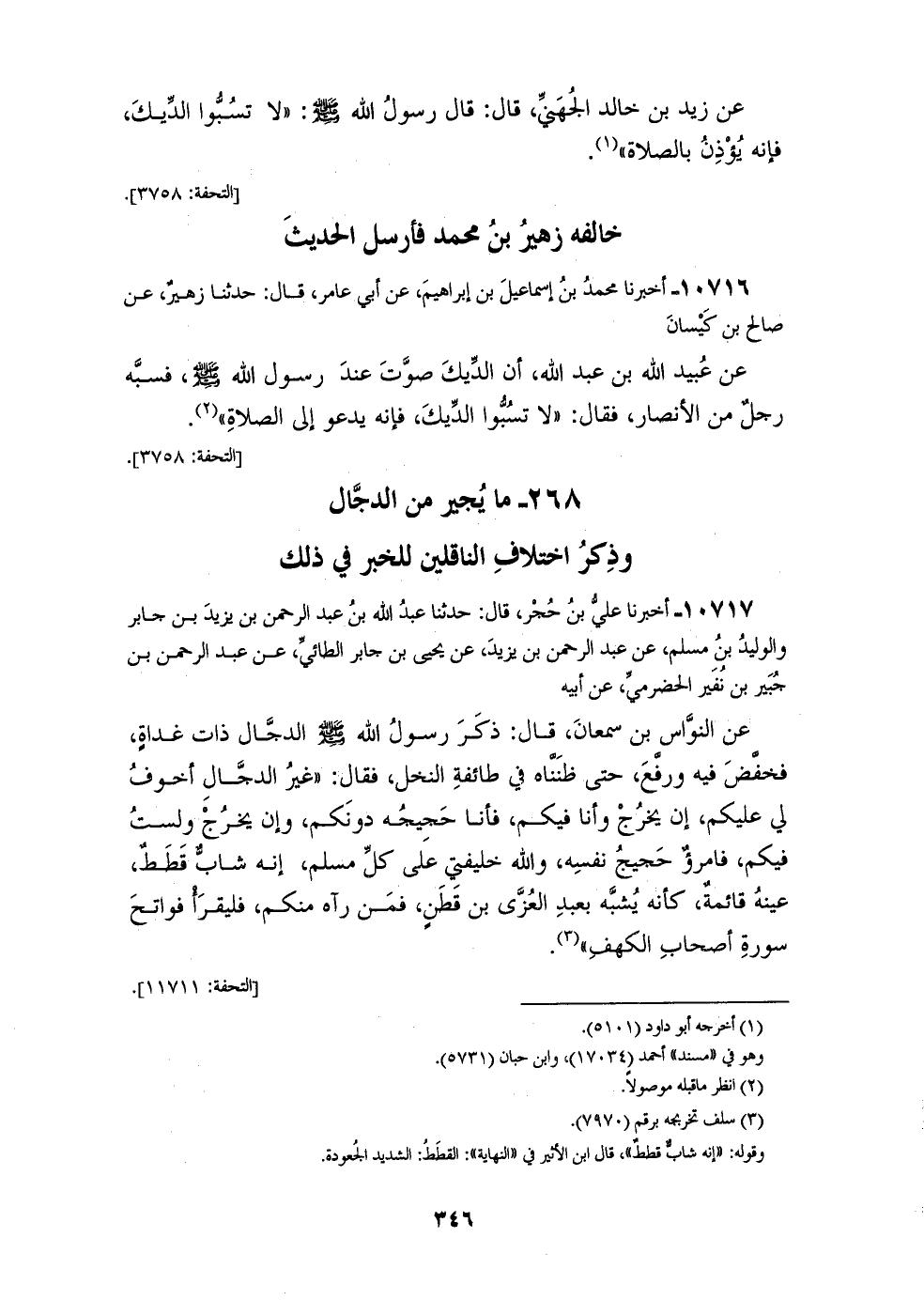 10717 - أَخْبَرَنَا عَلِيُّ بْنُ حُجْرٍ، قَالَ: حَدَّثَنَا عَبْدُ اللهِ بْنُ عَبْدِ الرَّحْمَنِ بْنِ يَزِيدَ بْنِ جَابِرٍ، وَالْوَلِيدُ بْنُ مُسْلِمٍ، عَنْ عَبْدِ الرَّحْمَنِ بْنِ يَزِيدَ، عَنْ يَحْيَى بْنِ جَابِرٍ الطَّائِيِّ، عَنْ عَبْدِ الرَّحْمَنِ بْنِ جُبَيْرِ بْنِ نُفَيْرٍ الْحَضْرَمِيِّ، عَنْ أَبِيهِ، عَنِ النَّوَّاسِ بْنِ سَمْعَانَ، قَالَ: ذَكَرَ رَسُولُ اللهِ صَلَّى اللهُ عَلَيْهِ وَسَلَّمَ الدَّجَّالَ ذَاتَ غَدَاةٍ، فَخَفَّضَ فِيهِ وَرَفَعَ حَتَّى ظَنَنَّاهُ فِي طَائِفَةِ النَّخْلِ، فَقَالَ: «§غَيْرُ الدَّجَّالِ أَخْوَفُ لِي عَلَيْكُمْ، إِنْ يَخْرُجْ وَأَنَا فِيكُمْ فَأَنَا حَجِيجُهُ دُونَكُمْ، وَإِنْ يَخْرُجْ وَلَسْتُ فِيكُمْ فَامْرُؤٌ حَجِيجُ نَفْسِهِ، وَاللهُ خَلِيفَتِي عَلَى كُلِّ مُسْلِمٍ، إِنَّهُ شَابٌّ قَطَطٌ، عَيْنُهُ قَائِمَةٌ، كَأَنَّهُ يُشَبَّهُ بِعَبْدِ الْعُزَّى بْنِ قَطَنٍ، فَمَنْ رَآهُ مِنْكُمْ فَلْيَقْرَأْ فَوَاتِحَ سُورَةَ أَصْحَابِ الْكَهْفِ»
