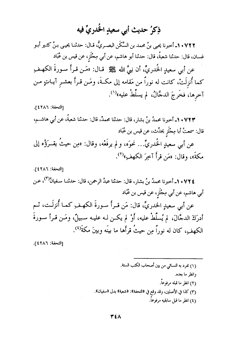 10722 - أَخْبَرَنَا يَحْيَى بْنُ مُحَمَّدِ بْنِ السَّكَنِ الْبَصْرِيُّ، قَالَ: حَدَّثَنَا يَحْيَى بْنُ كَثِيرٍ أَبُو غَسَّانَ، قَالَ: حَدَّثَنَا شُعْبَةُ، قَالَ: حَدَّثَنَا أَبُو هَاشِمٍ، عَنْ أَبِي مِجْلَزٍ، عَنْ قَيْسِ بْنِ عُبَادٍ، عَنْ أَبِي سَعِيدٍ الْخُدْرِيِّ، أَنَّ نَبِيَّ اللهِ صَلَّى اللهُ عَلَيْهِ وَسَلَّمَ قَالَ: «§مَنْ قَرَأَ سُورَةَ الْكَهْفِ كَمَا أُنْزِلَتْ كَانَتْ لَهُ نُورًا مِنْ مَقَامِهِ إِلَى مَكَّةَ، وَمَنْ قَرَأَ بِعَشْرِ آيَاتٍ مِنْ آخِرِهَا فَخَرَجَ الدَّجَّالُ لَمْ يُسَلَّطْ عَلَيْهِ»،