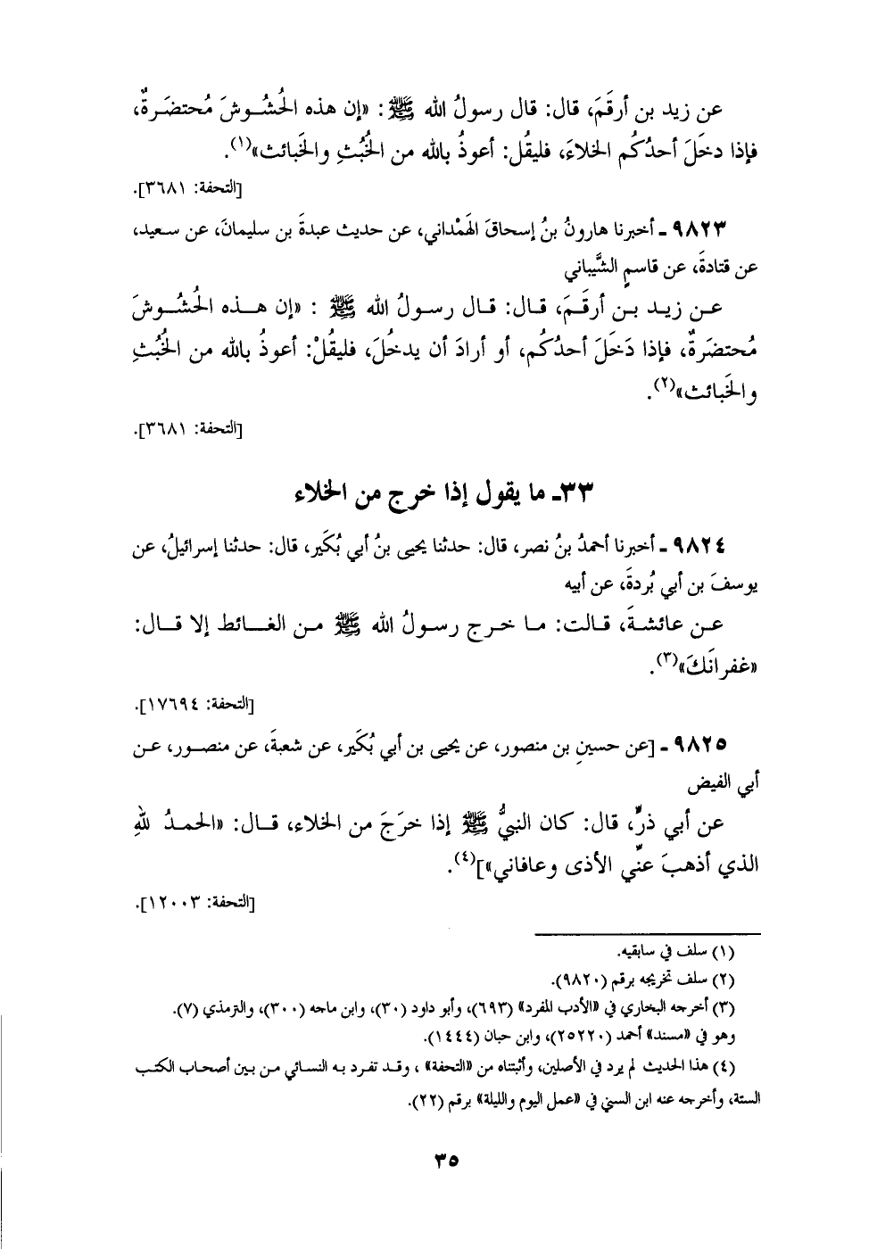 9825 - عَنْ حُسَيْنِ بْنِ مَنْصُورٍ، عَنْ يَحْيَى بْنِ أَبِي بُكَيْرٍ، عَنْ شُعْبَةَ، عَنْ مَنْصُورٍ، عَنْ أَبِي الْفَيْضِ، عَنْ أَبِي ذَرٍّ قَالَ: كَانَ النَّبِيُّ صَلَّى اللهُ عَلَيْهِ وَسَلَّمَ §إِذَا خَرَجَ مِنَ الْخَلَاءِ، قَالَ: «الْحمْدُ لِلَّهِ الَّذِي أَذْهَبَ عَنِّي الْأَذَى وَعَافَانِي» -[36]-،