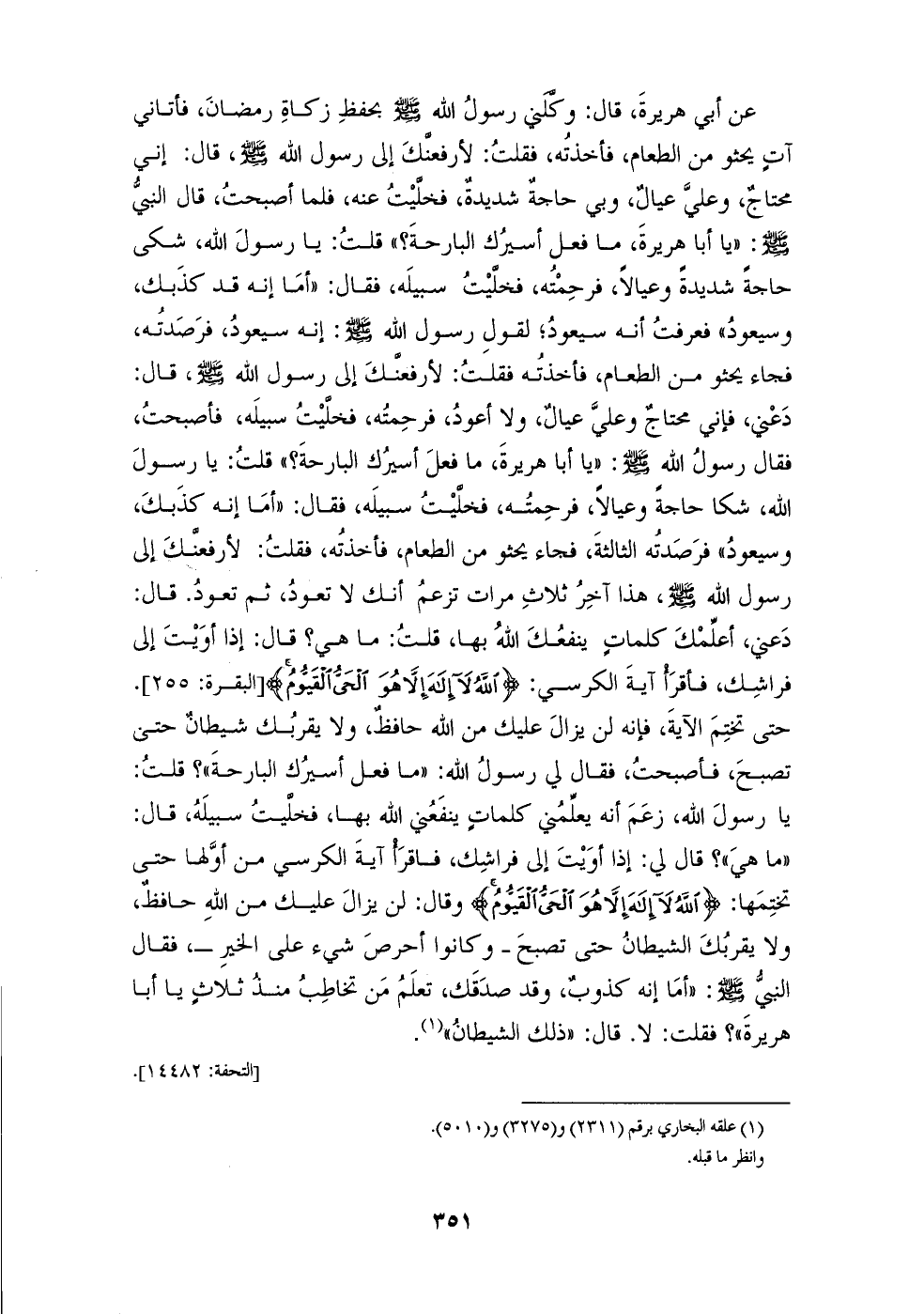 10729 - أَخْبَرَنَا إِبْرَاهِيمُ بْنُ يَعْقُوبَ، قَالَ: حَدَّثَنَا عُثْمَانُ بْنُ الْهَيْثَمِ، قَالَ: حَدَّثَنَا عَوْفٌ، عَنْ مُحَمَّدٍ، عَنْ أَبِي هُرَيْرَةَ، قَالَ: وَكَّلَنِي رَسُولُ اللهِ صَلَّى اللهُ عَلَيْهِ وَسَلَّمَ بِحِفْظِ زَكَاةِ رَمَضَانَ، فَأَتَانِي آتٍ يَحْثُو مِنَ الطَّعَامِ، فَأَخَذْتُهُ فَقُلْتُ: لَأَرْفَعَنَّكَ إِلَى رَسُولِ اللهِ صَلَّى اللهُ عَلَيْهِ وَسَلَّمَ، قَالَ: إِنِّي مُحْتَاجٌ وَعَلَيَّ عِيَالٌ وَبِي حَاجَةٌ شَدِيدَةٌ، فَخَلَّيْتُ عَنْهُ، فَلَمَّا أَصْبَحْتُ قَالَ النَّبِيُّ صَلَّى اللهُ عَلَيْهِ وَسَلَّمَ: «يَا أَبَا هُرَيْرَةَ §مَا فَعَلَ أَسِيرُكَ الْبَارِحَةَ؟» قُلْتُ: يَا رَسُولَ اللهِ، شَكَى حَاجَةً شَدِيدَةً وَعِيَالًا، فَرَحِمْتُهُ فَخَلَّيْتُ سَبِيلَهُ، فَقَالَ: «أَمَا إِنَّهُ قَدْ كَذَبَكَ، وَسَيَعُودُ» فَعَرَفْتُ أَنَّهُ سَيَعُودُ لِقَوْلِ رَسُولِ اللهِ صَلَّى اللهُ عَلَيْهِ وَسَلَّمَ: إِنَّهُ سَيَعُودُ، فَرَصَدْتُهُ فَجَاءَ يَحْثُو مِنَ الطَّعَامِ فَقُلْتُ: لَأَرْفَعَنَّكَ إِلَى رَسُولِ اللهِ صَلَّى اللهُ عَلَيْهِ وَسَلَّمَ، قَالَ: دَعْنِي فَإِنِّي مُحْتَاجٌ وَعَلَيَّ عِيَالٌ وَلَا أَعُودُ، فَرَحِمْتُهُ فَخَلَّيْتُ سَبِيلَهُ، فَأَصْبَحَتْ فَقَالَ رَسُولُ اللهِ صَلَّى اللهُ عَلَيْهِ وَسَلَّمَ: «يَا أَبَا هُرَيْرَةَ، مَا فَعَلَ أَسِيرُكَ الْبَارِحَةَ؟» قُلْتُ: يَا رَسُولَ اللهِ، شَكَا حَاجَةً وَعِيَالًا، فَرَحِمْتُهُ فَخَلَّيْتُ سَبِيلَهُ، فَقَالَ: أَمَا إِنَّهُ كَذَبَكَ، وَسَيَعُودُ " فَرَصَدْتُهُ الثَّالِثَةَ فَجَاءَ يَحْثُو مِنَ الطَّعَامِ فَأَخَذْتُهُ فَقُلْتُ: لَأَرْفَعَنَّكَ إِلَى رَسُولِ اللهِ صَلَّى اللهُ عَلَيْهِ وَسَلَّمَ هَذَا آخِرُ ثَلَاثِ مَرَّاتٍ تَزْعُمُ أَنَّكَ لَا تَعُودُ ثُمَّ تَعُودُ، قَالَ: دَعْنِي أُعَلِّمْكَ كَلِمَاتٍ يَنْفَعُكَ اللهُ بِهَا، قُلْتُ: مَا هِيَ؟ قَالَ: إِذَا أَوَيْتَ إِلَى فِرَاشِكَ فَاقْرَأْ آيَةَ الْكُرْسِيِّ {اللهُ لَا إِلَهَ إِلَّا هُوَ الْحَيُّ الْقَيُّومُ} [البقرة: 255] حَتَّى تَخْتِمَ الْآيَةَ، فَإِنَّهُ لَنْ يَزَالَ عَلَيْكَ مِنَ اللهِ حَافِظٌ، وَلَا يَقْرَبُكَ شَيْطَانٌ حَتَّى تُصْبِحَ، فَأَصْبَحْتُ فَقَالَ لِي رَسُولُ اللهِ: «مَا فَعَلَ أَسِيرُكَ الْبَارِحَةَ؟» قُلْتُ: يَا رَسُولَ اللهِ، زَعَمَ أَنَّهُ يُعَلِّمُنِي كَلِمَاتٍ يَنْفَعُنِي اللهُ بِهَا فَخَلَّيْتُ سَبِيلَهُ، قَالَ: «مَا هِيَ؟» قَالَ لِي: إِذَا أَوَيْتَ إِلَى فِرَاشِكَ فَاقْرَأْ آيَةَ الْكُرْسِيِّ مِنْ أَوَّلِهَا حَتَّى تَخْتِمَهَا {اللهُ لَا إِلَهَ إِلَّا هُوَ الْحَيُّ الْقَيُّومُ} [البقرة: 255] وَقَالَ: لَنْ يَزَالَ عَلَيْكَ مِنَ اللهِ حَافِظٌ وَلَا يَقْرَبُكَ الشَّيْطَانُ حَتَّى تُصْبِحَ، وَكَانُوا أَحْرَصَ شَيْءٍ عَلَى الْخَيْرِ، فَقَالَ النَّبِيُّ صَلَّى اللهُ عَلَيْهِ وَسَلَّمَ: «أَمَا إِنَّهُ كَذُوبٌ وَقَدْ صَدَقَكَ، تَعْلَمُ مَنْ تُخَاطِبُ مُنْذُ ثَلَاثٍ، يَا أَبَا هُرَيْرَةَ؟» فَقُلْتُ: لَا، قَالَ: «ذَلِكَ الشَّيْطَانُ»