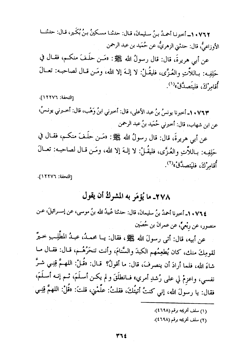 10763 - أَخْبَرَنَا يُونُسُ بْنُ عَبْدِ الْأَعْلَى، قَالَ: أَخْبَرَنِي ابْنُ وَهْبٍ، قَالَ: أَخْبَرَنِي يُونُسُ، عَنِ ابْنِ شِهَابٍ، قَالَ: أَخْبَرَنِي حُمَيْدُ بْنُ عَبْدِ الرَّحْمَنِ، عَنْ أَبِي هُرَيْرَةَ، قَالَ: قَالَ رَسُولُ اللهِ صَلَّى اللهُ عَلَيْهِ وَسَلَّمَ: " §مَنْ حَلَفَ مِنْكُمْ فَقَالَ فِي حَلِفِهِ: بِاللَّاتِ وَالْعُزَّى، فَلْيَقُلْ: لَا إِلَهَ إِلَّا اللهُ، وَمَنْ قَالَ لِصَاحِبِهِ: تَعَالَ أُقَامِرْكَ، فَلْيَتَصَدَّقْ "