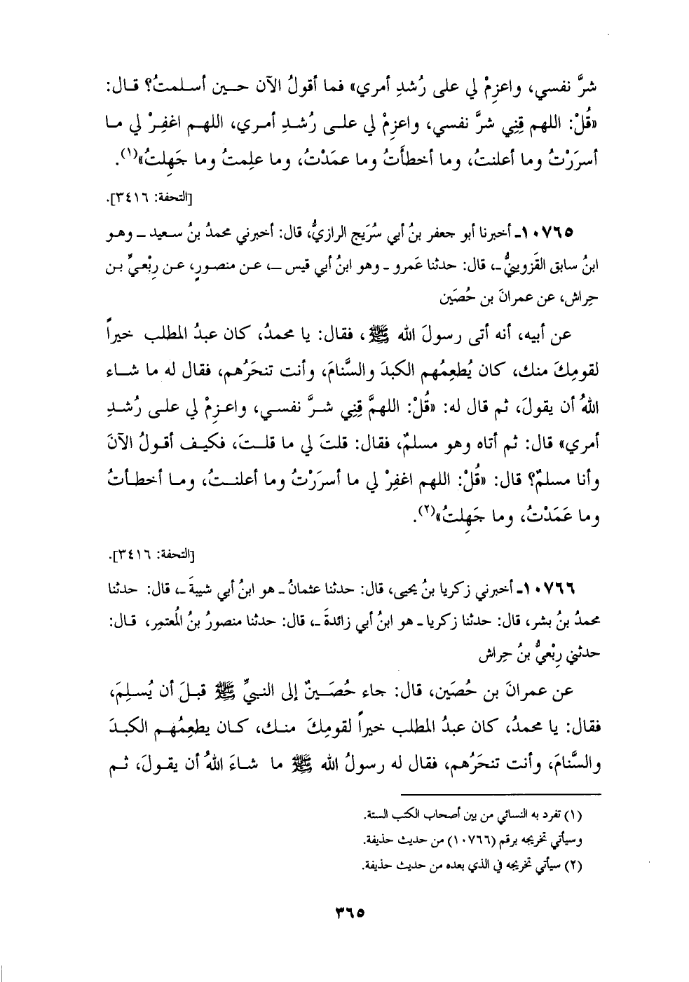 10766 - أَخْبَرَنِي زَكَرِيَّا بْنُ يَحْيَى، قَالَ: حَدَّثَنَا عُثْمَانُ هُوَ ابْنُ أَبِي شَيْبَةَ، قَالَ: حَدَّثَنَا مُحَمَّدُ بْنُ بِشْرٍ، قَالَ: حَدَّثَنَا زَكَرِيَّا هُوَ ابْنُ أَبِي زَائِدَةَ، قَالَ: حَدَّثَنَا مَنْصُورُ بْنُ الْمُعْتَمِرِ، قَالَ: حَدَّثَنِي رِبْعِيُّ بْنُ حِرَاشٍ، عَنْ عِمْرَانَ بْنِ حُصَيْنٍ، قَالَ: جَاءَ حُصَيْنٌ إِلَى النَّبِيِّ صَلَّى اللهُ عَلَيْهِ وَسَلَّمَ قَبْلَ أَنْ يُسْلِمَ فَقَالَ: يَا مُحَمَّدُ، كَانَ عَبْدُ الْمُطَّلِبِ خَيْرًا لِقَوْمِكَ مِنْكَ، كَانَ يُطْعِمُهُمُ الْكَبِدَ وَالسَّنَامَ، وَأَنْتَ تَنْحَرُهُمْ، فَقَالَ لَهُ رَسُولُ اللهِ صَلَّى اللهُ عَلَيْهِ وَسَلَّمَ مَا شَاءَ اللهُ أَنْ يَقُولَ، ثُمَّ إِنَّ حُصَيْنًا قَالَ: يَا مُحَمَّدُ، مَاذَا تَأْمُرُنِي أَنْ أَقُولَ؟ قَالَ: " §تَقُولُ: اللهُمَّ إِنِّي أَعُوذُ بِكَ مِنْ شَرِّ نَفْسِي، وَأَسْأَلُكَ أَنْ تَعْزِمَ لِي عَلَى رُشْدٍ أَمْرِي " ثُمَّ إِنَّ حُصَيْنًا أَسْلَمَ بَعْدُ، ثُمَّ أَتَى النَّبِيَّ صَلَّى اللهُ عَلَيْهِ وَسَلَّمَ فَقَالَ: إِنِّي كُنْتُ سَأَلْتُكَ الْمَرَّةَ الْأُولَى، وَإِنِّي أَقُولُ الْآنَ: مَا تَأْمُرُنِي أَنْ أَقُولَ؟ قَالَ: " قُلِ: اللهُمَّ اغْفِرْ لِي مَا أَسْرَرْتُ وَمَا أَعْلَنْتُ، وَمَا أَخْطَأْتُ وَمَا جَهِلْتُ، وَمَا عَلِمْتُ "