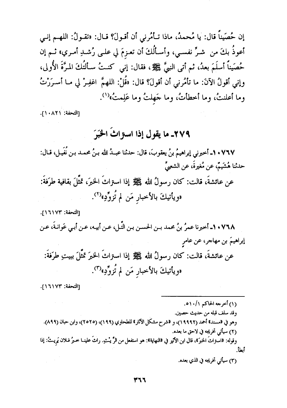 10767 - أَخْبَرَنِي إِبْرَاهِيمُ بْنُ يَعْقُوبَ، قَالَ: حَدَّثَنَا عَبْدُ اللهِ بْنُ مُحَمَّدِ بْنِ نُفَيْلٍ، قَالَ: حَدَّثَنَا هُشَيْمٌ، عَنْ مُغِيرَةَ، عَنِ الشَّعْبِيِّ، عَنْ عَائِشَةَ، قَالَتْ: " كَانَ رَسُولُ اللهِ صَلَّى اللهُ عَلَيْهِ وَسَلَّمَ إِذَا §اسْتَرَاثَ الْخَبَرَ تَمَثَّلَ بِقَافِيَةِ طَرَفَةَ: وَيَأْتِيكَ بِالْأَخْبَارِ مَنْ لَمْ تُزَوِّدِ "