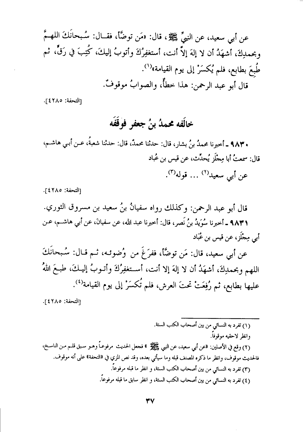 9829 - أَخْبَرَنَا يَحْيَى بْنُ مُحَمَّدِ بْنِ السَّكَنِ قَالَ: حَدَّثَنَا يَحْيَى بْنُ كَثِيرٍ أَبُو غَسَّانَ قَالَ: حَدَّثَنَا شُعْبَةُ قَالَ: حَدَّثَنَا أَبُو هَاشِمٍ، عَنْ أَبِي مِجْلَزٍ، عَنْ قَيْسِ بْنِ عُبَادٍ، عَنْ أَبِي سَعِيدٍ عَنِ النَّبِيِّ صَلَّى اللهُ عَلَيْهِ وَسَلَّمَ قَالَ: " مَنْ §تَوَضَّأَ فَقَالَ: سُبْحَانَكَ اللهُمَّ، وَبِحَمْدِكَ أَشْهَدُ أَنْ لَا إِلَهَ إِلَّا أَنْتَ، أَسْتَغْفِرُكَ وَأَتُوبُ إِلَيْكَ، كُتِبَ فِي رَقٍّ ثُمَّ طُبِعَ بِطَابَعٍ فَلَمْ يُكْسَرْ إِلَى يَوْمِ الْقِيَامَةِ " قَالَ أَبُو عَبْدِ الرَّحْمَنِ: هَذَا خَطَأٌ، وَالصَّوَابُ مَوْقُوفٌ، خَالَفَهُ مُحَمَّدُ بْنُ جَعْفَرٍ فَوَقَفَهُ،