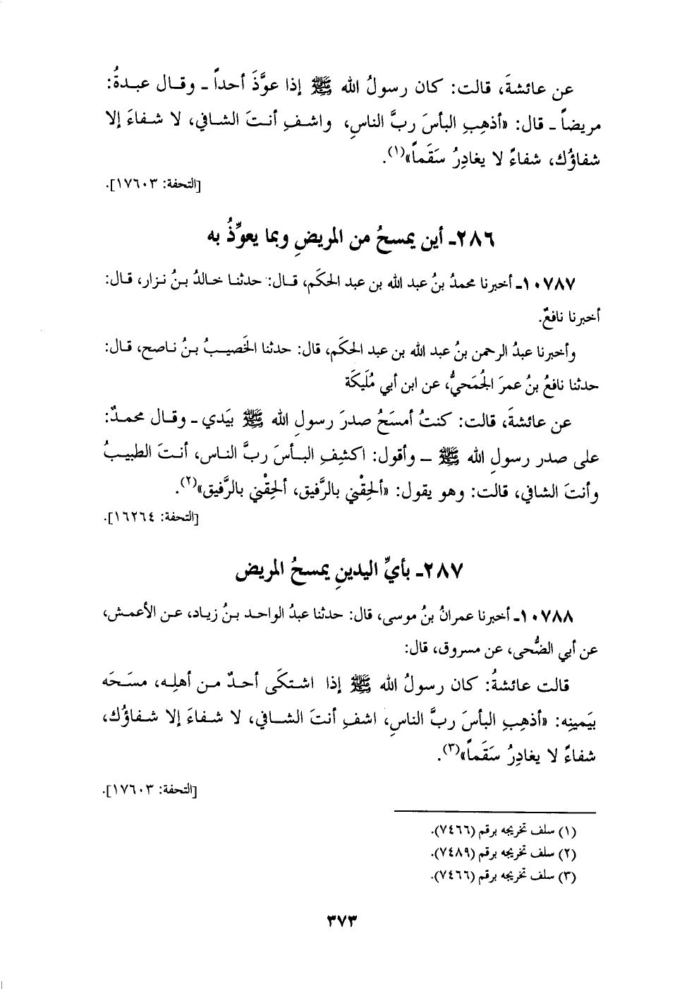 10788 - أَخْبَرَنَا عِمْرَانُ بْنُ مُوسَى، قَالَ: حَدَّثَنَا عَبْدُ الْوَاحِدِ بْنُ زِيَادٍ، عَنِ الْأَعْمَشِ، عَنْ أَبِي الضُّحَى، عَنْ مَسْرُوقٍ، قَالَ: قَالَتْ عَائِشَةُ: كَانَ رَسُولُ اللهِ صَلَّى اللهُ عَلَيْهِ وَسَلَّمَ إِذَا اشْتَكَى أَحَدٌ مِنْ أَهْلِهِ مَسَحَهُ بِيَمِينِهِ: «§أَذْهِبِ الْبَأْسَ، رَبَّ النَّاسِ، اشْفِ أَنْتَ الشَّافِي، لَا شِفَاءَ إِلَّا شِفَاؤُكَ، شِفَاءً لَا يُغَادِرُ سَقَمًا»
