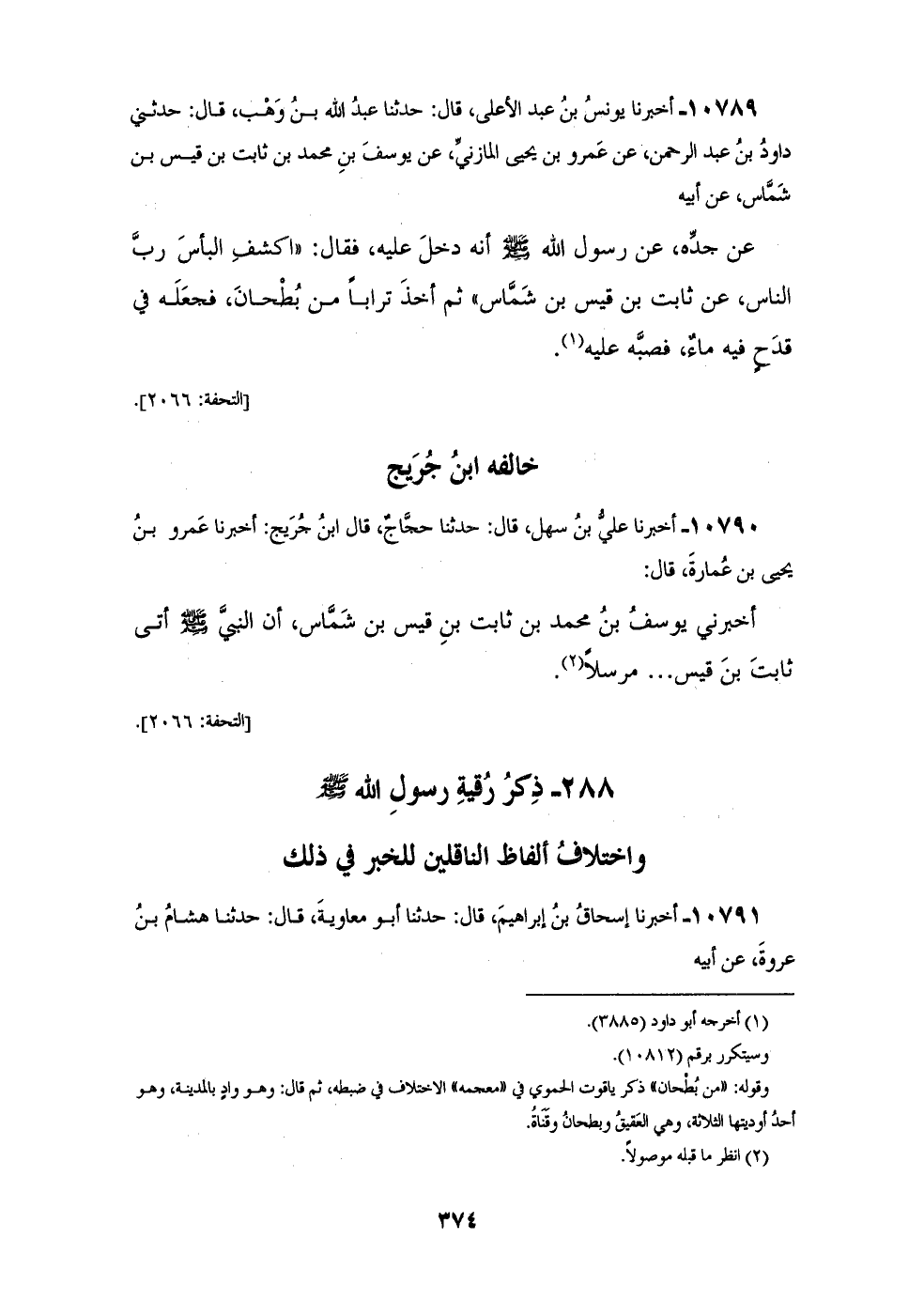 10789 - أَخْبَرَنَا يُونُسُ بْنُ عَبْدِ الْأَعْلَى، قَالَ: حَدَّثَنَا عَبْدُ اللهِ بْنُ وَهْبٍ، قَالَ: حَدَّثَنِي دَاوُدُ بْنُ عَبْدِ الرَّحْمَنِ، عَنْ عَمْرِو بْنِ يَحْيَى الْمَازِنِيِّ، عَنْ يُوسُفَ بْنِ مُحَمَّدِ بْنِ ثَابِتِ بْنِ قَيْسِ بْنِ شَمَّاسٍ، عَنْ أَبِيهِ، عَنْ جَدِّهِ عَنْ رَسُولِ اللهِ صَلَّى اللهُ عَلَيْهِ وَسَلَّمَ، أَنَّهُ دَخَلَ عَلَيْهِ فَقَالَ: «§اكْشِفِ الْبَأْسَ، رَبَّ النَّاسِ» عَنْ ثَابِتِ بْنِ قَيْسِ بْنِ شَمَّاسٍ، ثُمَّ أَخَذَ تُرَابًا مِنْ بُطْحَانَ فَجَعَلَهُ فِي قَدَحٍ فِيهِ مَاءٌ، فَصَبَّهُ عَلَيْهِ، خَالَفَهُ ابْنُ جُرَيْجٍ،