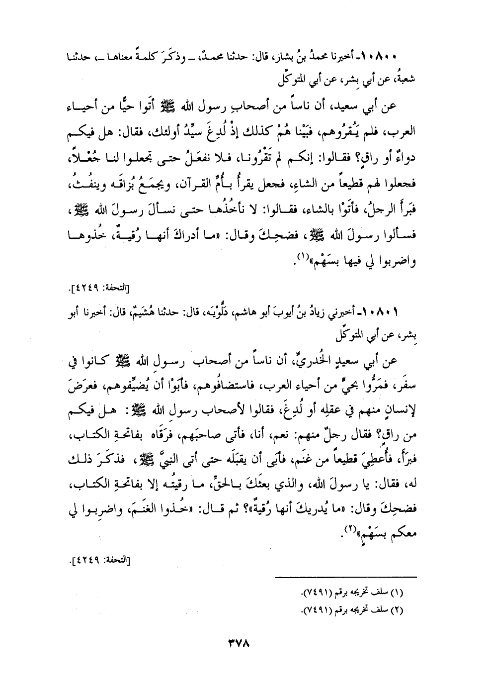10801 - أَخْبَرَنِي زِيَادُ بْنُ أَيُّوبَ أَبُو هَاشِمٍ، دَلُّوَيْهِ قَالَ: حَدَّثَنَا هُشَيْمٌ، قَالَ: أَخْبَرَنَا أَبُو بِشْرٍ، عَنْ أَبِي الْمُتَوَكِّلِ، عَنْ أَبِي سَعِيدٍ الْخُدْرِيِّ، أَنَّ نَاسًا، مِنْ أَصْحَابِ رَسُولِ اللهِ صَلَّى اللهُ عَلَيْهِ وَسَلَّمَ كَانُوا فِي سَفَرٍ فَمَرُّوا بِحَيٍّ مِنْ أَحْيَاءِ الْعَرَبِ، فَاسْتَضَافُوهُمْ فَأَبَوْا أَنْ يُضَيِّفُوهُمْ، فَعَرَضَ لِإِنْسَانٍ مِنْهُمْ فِي عَقْلِهِ أَوْ لُدِغَ، فَقَالُوا لِأَصْحَابِ رَسُولِ اللهِ صَلَّى اللهُ عَلَيْهِ وَسَلَّمَ: هَلْ فِيكُمْ مِنْ رَاقٍ؟ فَقَالَ رَجُلٌ مِنْهُمْ: نَعَمْ أَنَا، فَأَتَى صَاحِبَهُمْ فَرَقَاهُ بِفَاتِحَةِ الْكِتَابِ فَبَرِأَ، فَأُعْطِيَ قَطِيعًا مِنْ غَنَمٍ، فَأَبَى أَنْ يَقْبَلَهُ حَتَّى أَتَى النَّبِيَّ صَلَّى اللهُ عَلَيْهِ وَسَلَّمَ، فَذَكَرَ ذَلِكَ لَهُ فَقَالَ: يَا رَسُولَ اللهِ، وَالَّذِي بَعَثَكَ بِالْحَقِّ مَا رَقَيْتُهُ إِلَّا بِفَاتِحَةِ الْكِتَابِ، فَضَحِكَ وَقَالَ: «§مَا يُدْرِيكَ أَنَّهَا رُقْيَةٌ؟» ثُمَّ قَالَ: «خُذُوا الْغَنَمَ، وَاضْرِبُوا لِي مَعَكُمْ بِسَهْمٍ» -[379]-،
