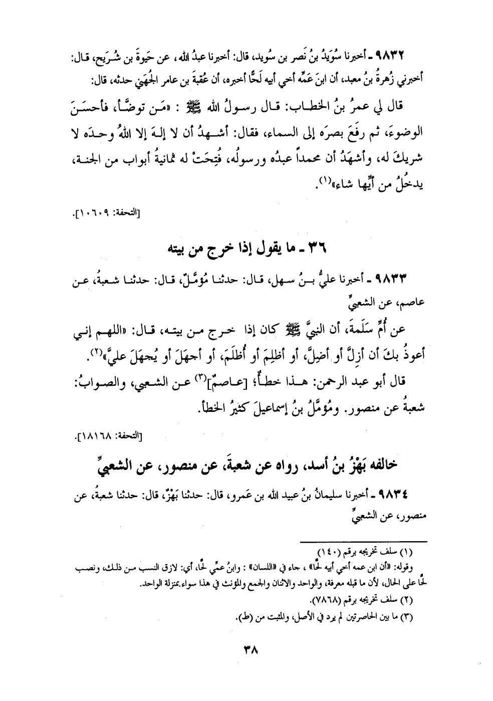 9834 - أَخْبَرَنَا سُلَيْمَانُ بْنُ عُبَيْدِ اللهِ بْنِ عَمْرٍو قَالَ: حَدَّثَنَا بَهْزٌ قَالَ: حَدَّثَنَا شُعْبَةُ، عَنْ مَنْصُورٍ، عَنِ الشَّعْبِيِّ، عَنْ أُمِّ سَلَمَةَ، أَنَّ رَسُولَ اللهِ صَلَّى اللهُ عَلَيْهِ وَسَلَّمَ كَانَ إِذَا خَرَجَ مِنْ بَيْتِهِ قَالَ: «اللهُمَّ إِنِّي §أَعُوذُ بِكَ مِنْ أنْ أَزِلَّ أَوْ أَضِلَّ، أَوْ أَظْلِمَ أَوْ أُظْلَمَ، أَوْ أَجْهَلَ أَوْ يَجْهَلَ عَلَيَّ» -[39]- رَوَاهُ سُفْيَانُ وَزَادَ فِيهِ: «بِاسْمِ اللهِ، تَوَكَّلْتُ عَلَى اللهِ»