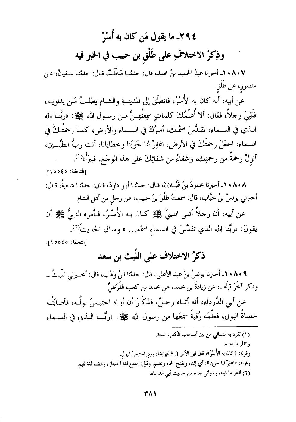 10807 - أَخْبَرَنَا عَبْدُ الْحَمِيدِ بْنُ مُحَمَّدٍ، قَالَ: حَدَّثَنَا مَخْلَدٌ، قَالَ: حَدَّثَنَا سُفْيَانُ، عَنْ مَنْصُورٍ، عَنْ طَلْقٍ، عَنْ أَبِيهِ، أَنَّهُ كَانَ بِهِ الْأُسْرُ، فَانْطَلَقَ إِلَى الْمَدِينَةِ وَالشَّامِ يَطْلُبُ مَنْ يُدَاوِيهِ، فَلَقِيَ رَجُلًا فَقَالَ: أَلَا أُعَلِّمُكَ كَلِمَاتٍ سَمِعْتُهُنَّ مِنْ رَسُولِ اللهِ صَلَّى اللهُ عَلَيْهِ وَسَلَّمَ: «§رَبَّنَا اللهَ الَّذِي فِي السَّمَاءِ، تَقَدَّسَ اسْمُكَ، أَمْرُكَ فِي السَّمَاءِ وَالْأَرْضِ، كَمَا رَحْمَتُكَ فِي السَّمَاءِ اجْعَلْ رَحْمَتَكَ فِي الْأَرْضِ، اغْفِرْ لَنَا حُوبَنَا وَخَطَايَانَا، أَنْتَ رَبُّ الطَّيِّبِينَ، أَنْزِلْ رَحْمَةً مِنْ رَحْمَتِكَ، وَشِفَاءً مِنْ شِفَائِكَ عَلَى هَذَا الْوَجَعِ فَيَبْرَأُ»،