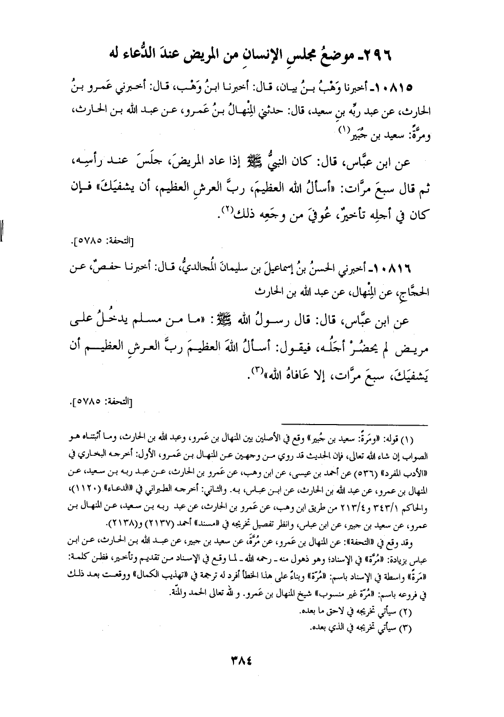 10815 - أَخْبَرَنَا وَهْبُ بْنُ بَيَانٍ، قَالَ: أَخْبَرَنَا ابْنُ وَهْبٍ، قَالَ: أَخْبَرَنِي عَمْرُو بْنُ الْحَارِثِ، عَنْ عَبْدِ رَبِهِ بْنِ سَعِيدٍ، قَالَ: حَدَّثَنِي الْمِنْهَالُ بْنُ عَمْرٍو، عَنْ عَبْدِ اللهِ بْنِ الْحَارِثِ، وَمَرَّةً سَعِيدِ بْنِ جُبَيْرٍ، عَنْ عَنِ ابْنِ عَبَّاسٍ، قَالَ: كَانَ النَّبِيُّ صَلَّى اللهُ عَلَيْهِ وَسَلَّمَ إِذَا عَادَ الْمَرِيضَ جَلَسَ عِنْدَ رَأْسِهِ ثُمَّ قَالَ سَبْعَ مَرَّاتٍ: «§أَسْأَلُ اللهَ الْعَظِيمَ رَبَّ الْعَرْشِ الْعَظِيمَ، أَنْ يَشْفِيَكَ، فَإِنْ كَانَ فِي أَجَلِهِ تَأْخِيرٌ عُوفِيَ مِنْ وَجَعِهِ ذَلِكَ»