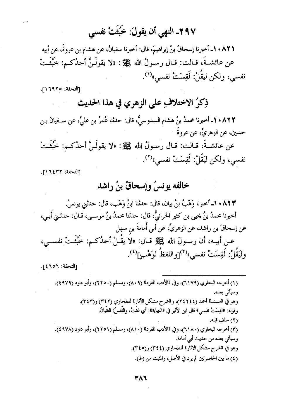 10822 - أَخْبَرَنَا مُحَمَّدُ بْنُ هِشَامٍ السَّدُوسِيُّ، قَالَ: حَدَّثَنَا عُمَرُ بْنُ عَلِيٍّ، عَنْ سُفْيَانَ بْنِ حُسَيْنٍ، عَنِ الزُّهْرِيِّ، عَنْ عُرْوَةَ، عَنْ عَائِشَةَ، قَالَتْ: قَالَ رَسُولُ اللهِ صَلَّى اللهُ عَلَيْهِ وَسَلَّمَ: " §لَا يَقُولَنَّ أَحَدُكُمْ: خَبُثَتْ نَفْسِي، وَلَكِنْ لِيَقُلْ: لَقِسَتْ نَفْسِي " خَالَفَهُ يُونُسُ وَإِسْحَاقُ بْنُ رَاشِدٍ
