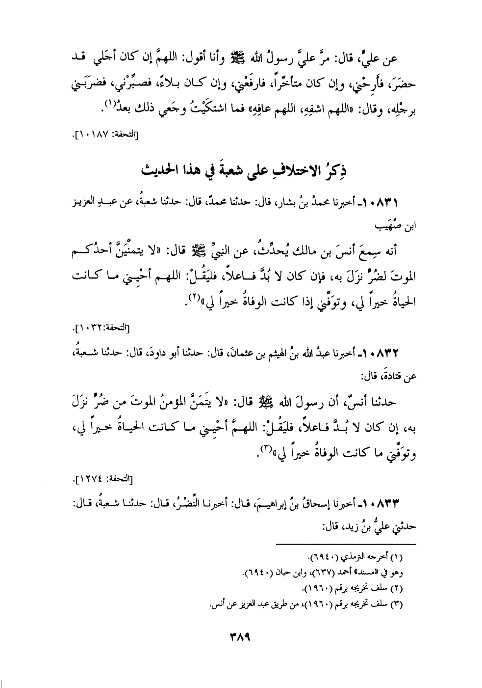 10833 - أَخْبَرَنَا إِسْحَاقُ بْنُ إِبْرَاهِيمَ، قَالَ: أَخْبَرَنَا النَّضْرُ، قَالَ: حَدَّثَنَا شُعْبَةُ، قَالَ: حَدَّثَنِي عَلِيُّ بْنُ زَيْدٍ، قَالَ: سَمِعْتُ أَنَسَ بْنَ مَالِكٍ، يَقُولُ: قَالَ رَسُولُ اللهِ صَلَّى اللهُ عَلَيْهِ وَسَلَّمَ: " §لَا يَتَمَنَّيَنَّ أَحَدُكُمُ الْمَوْتَ - أَوْ قَالَ: الْمُؤْمِنُ الْمَوْتَ - فَإِنْ كَانَ لَا بُدَّ فَاعِلًا فَلْيَقُلِ: اللهُمَّ أَحْيِنِي مَا كَانَتِ الْحَيَاةُ خَيْرًا لِي، وَتَوَفَّنِي إِذَا كَانَتِ الْوَفَاةُ خَيْرًا لِي "