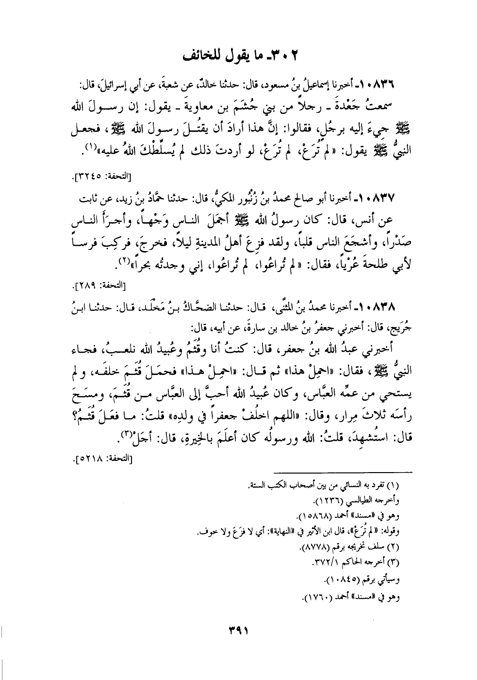 10836 - أَخْبَرَنَا إِسْمَاعِيلُ بْنُ مَسْعُودٍ، قَالَ: حَدَّثَنَا خَالِدٌ، عَنْ شُعْبَةَ، عَنْ أَبِي إِسْرَائِيلَ، قَالَ: سَمِعْتُ جَعْدَةَ، رَجُلًا مِنْ بَنِي جُشَمِ بْنِ مُعَاوِيَةَ يَقُولُ: إِنَّ رَسُولَ اللهِ صَلَّى اللهُ عَلَيْهِ وَسَلَّمَ جِيءَ إِلَيْهِ بِرَجُلٍ فَقَالُوا: إِنَّ هَذَا أَرَادَ أَنْ يَقْتُلَ رَسُولَ اللهِ صَلَّى اللهُ عَلَيْهِ وَسَلَّمَ، فَجَعَلَ النَّبِيُّ صَلَّى اللهُ عَلَيْهِ وَسَلَّمَ يَقُولُ: «§لَمْ تُرَعْ لَمْ تُرَعْ، لَوْ أَرَدْتَ ذَلِكَ لَمْ يُسَلِّطْكَ اللهُ عَلَيْهِ»