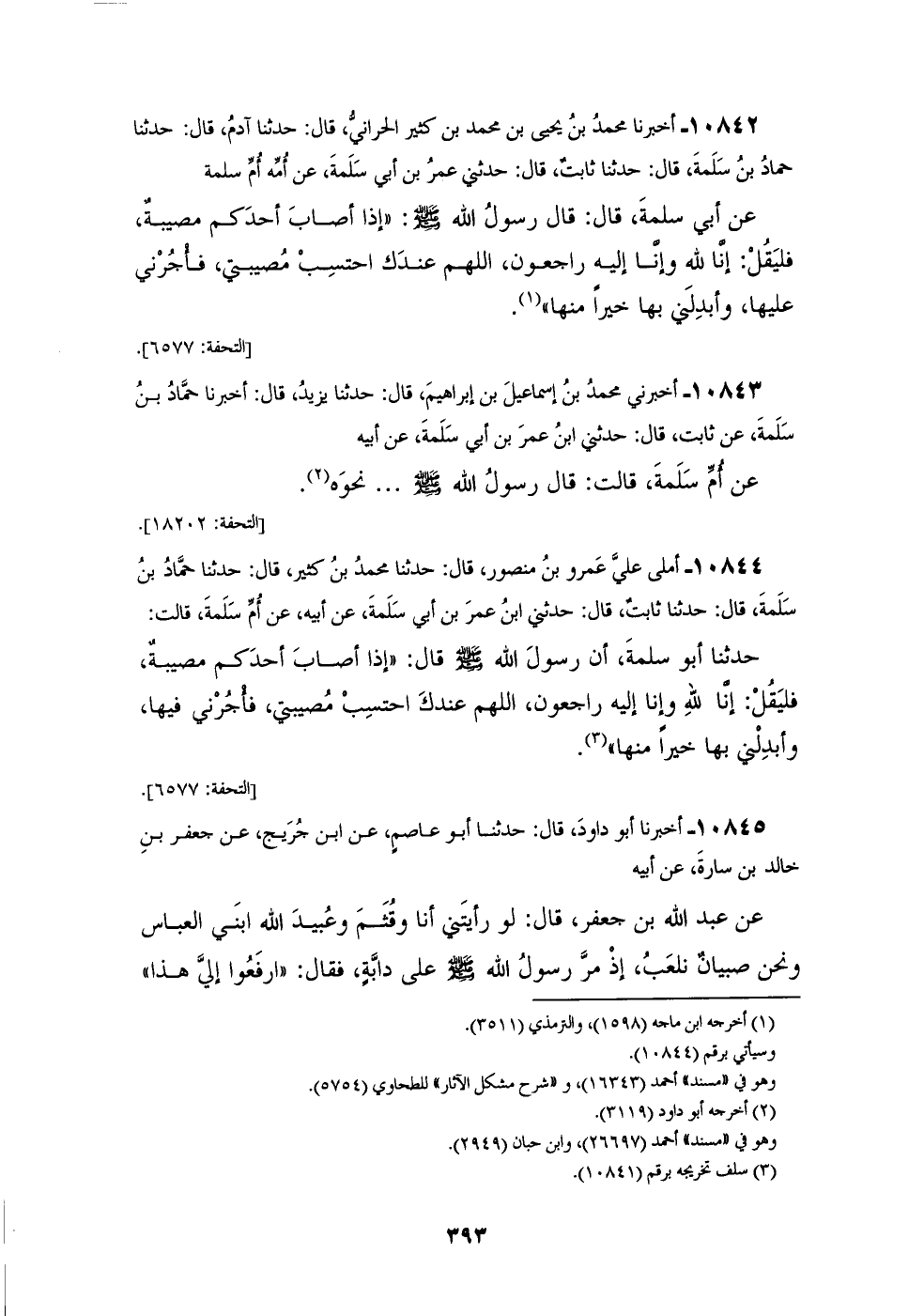 10844 - أَمْلَى عَلَيَّ عَمْرُو بْنُ مَنْصُورٍ، قَالَ: حَدَّثَنَا مُحَمَّدُ بْنُ كَثِيرٍ، قَالَ: حَدَّثَنَا حَمَّادُ بْنُ سَلَمَةَ، قَالَ: حَدَّثَنَا ثَابِتٌ، قَالَ: حَدَّثَنِي ابْنُ عُمَرَ بْنِ أَبِي سَلَمَةَ، عَنْ أَبِيهِ، عَنْ أُمِّ سَلَمَةَ، قَالَتْ: حَدَّثَنَا أَبُو سَلَمَةَ، أَنَّ رَسُولَ اللهِ صَلَّى اللهُ عَلَيْهِ وَسَلَّمَ قَالَ: " §إِذَا أَصَابَ أَحَدَكُمْ مُصِيبَةٌ فَلْيَقُلْ: {إِنَّا لِلَّهِ وَإِنَّا إِلَيْهِ رَاجِعُونَ} [البقرة: 156]، اللهُمَّ عِنْدَكَ أَحْتَسِبُ مُصِيبَتِي، فَأْجُرْنِي فِيهَا، وَأَبْدِلْنِي بِهَا خَيْرًا مِنْهَا "