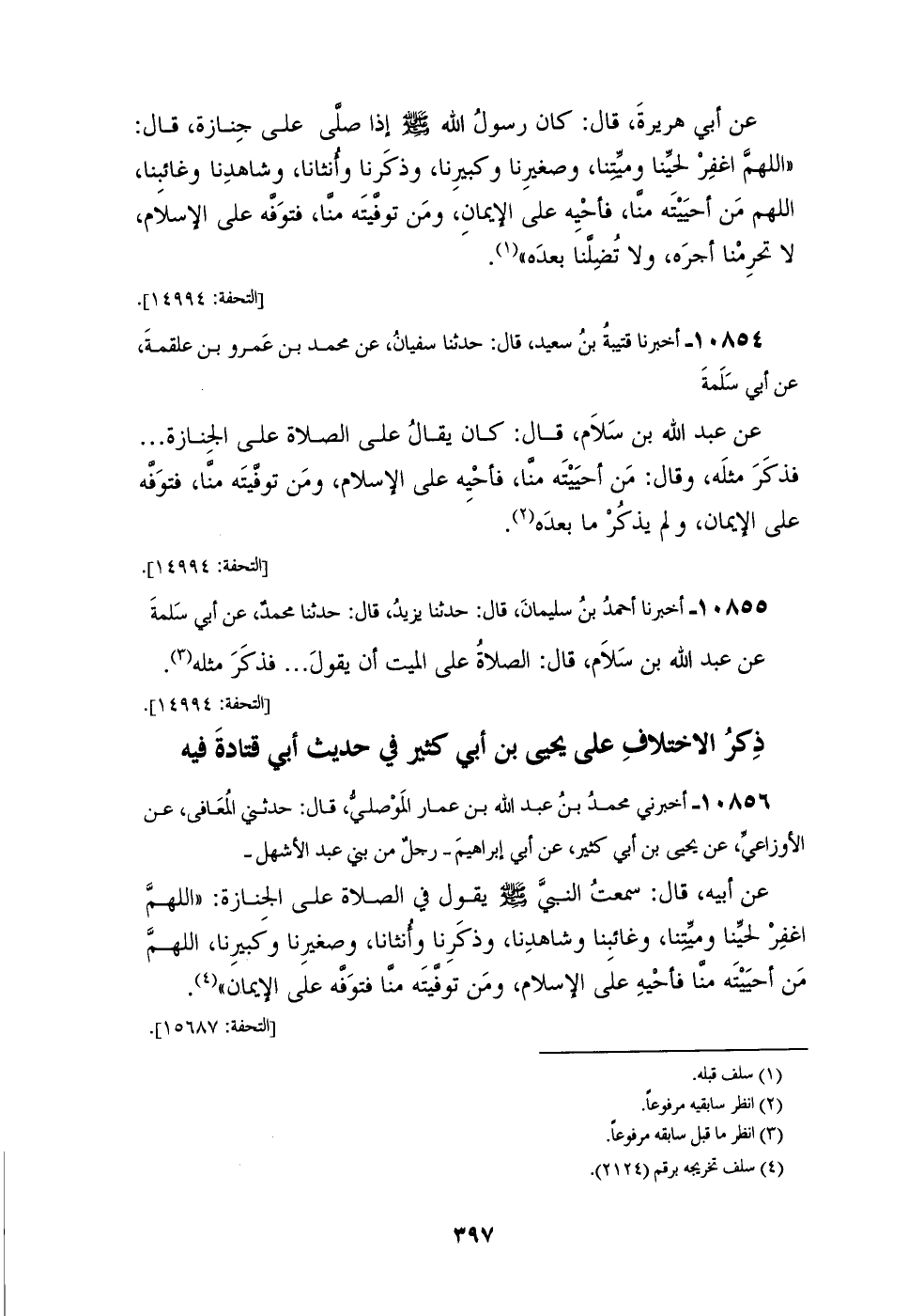 10856 - أَخْبَرَنِي مُحَمَّدُ بْنُ عَبْدِ اللهِ بْنِ عَمَّارٍ الْمَوْصِلِيُّ، قَالَ: حَدَّثَنِي الْمُعَافَى، عَنِ الْأَوْزَاعِيِّ، عَنْ يَحْيَى بْنِ أَبِي كَثِيرٍ، عَنْ أَبِي إِبْرَاهِيمَ، رَجُلٍ مِنْ بَنِي عَبْدِ الْأَشْهَلِ، عَنْ أَبِيهِ، قَالَ: سَمِعْتُ النَّبِيَّ صَلَّى اللهُ عَلَيْهِ وَسَلَّمَ يَقُولُ فِي الصَّلَاةِ عَلَى الْجَنَازَةِ: «§اللهُمَّ اغْفِرْ لِحَيِّنَا وَمَيِّتِنَا، وَغَائِبِنَا وَشَاهِدِنَا، وَذَكَرِنَا وَأُنْثَانَا، وَصَغِيرِنَا وَكَبِيرِنَا، اللهُمَّ مَنْ أَحْيَيْتَهُ مِنَّا فَأَحْيِهِ عَلَى الْإِسْلَامِ، وَمَنْ تَوَفَّيْتَهُ مِنَّا فَتَوَفَّهُ عَلَى الْإِيمَانِ» -[398]-.