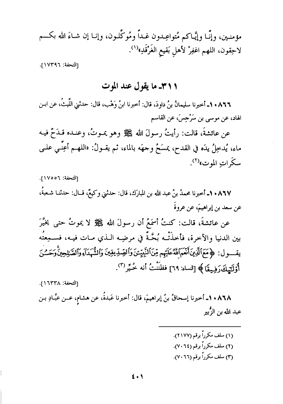 10867 - أَخْبَرَنَا مُحَمَّدُ بْنُ عَبْدِ اللهِ بْنِ الْمُبَارَكِ، قَالَ: حَدَّثَنِي وَكِيعٌ، قَالَ: حَدَّثَنَا شُعْبَةُ، عَنْ سَعْدِ بْنِ إِبْرَاهِيمَ، عَنْ عُرْوَةَ، عَنْ عَائِشَةَ، قَالَتْ: كُنْتُ أَسْمَعُ أَنَّ رَسُولَ اللهِ صَلَّى اللهُ عَلَيْهِ وَسَلَّمَ لَا يَمُوتُ حَتَّى يُخَيِّرَ بَيْنَ الدُّنْيَا وَالْآخِرَةِ، فَأَخَذْتُهُ بُحَّةٌ فِي مَرَضِهِ الَّذِي مَاتَ فِيهِ، فَسَمِعْتُهُ يَقُولُ: {§مَعَ الَّذِينَ أَنْعَمَ اللهُ عَلَيْهِمْ مِنَ النَّبِيِّينَ وَالصِّدِّيقِينَ وَالشُّهَدَاءِ وَالصَّالِحِينَ وَحَسُنَ أُولَئِكَ رَفِيقًا} [النساء: 69] فَظَنَنْتُ أَنَّهُ خُيِّرَ