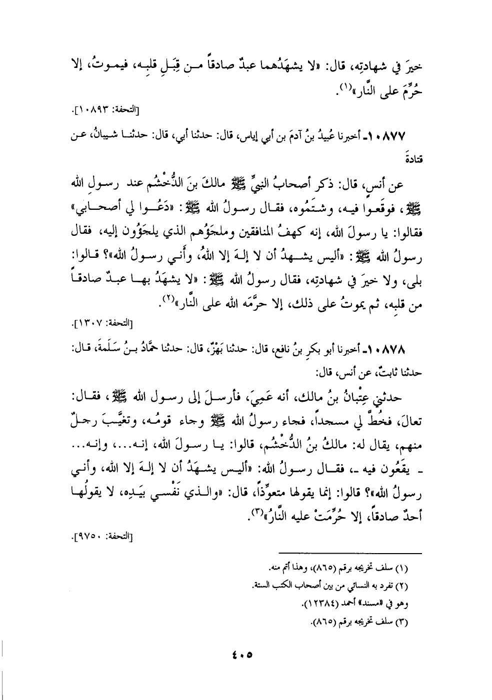 10877 - أَخْبَرَنَا عُبَيْدُ بْنُ آدَمَ بْنِ أَبِي إِيَاسٍ، قَالَ: حَدَّثَنَا أَبِي قَالَ: حَدَّثَنَا شَيْبَانُ، عَنْ قَتَادَةَ، عَنْ أَنَسٍ، قَالَ: ذَكَرَ أَصْحَابُ النَّبِيِّ صَلَّى اللهُ عَلَيْهِ وَسَلَّمَ مَالِكَ بْنَ الدُّخْشُمِ عِنْدَ رَسُولِ اللهِ صَلَّى اللهُ عَلَيْهِ وَسَلَّمَ فَوَقَعُوا فِيهِ وَشَتَمُوهُ، فَقَالَ رَسُولُ اللهِ صَلَّى اللهُ عَلَيْهِ وَسَلَّمَ: «دَعُوا لِي أَصْحَابِي» فَقَالُوا: يَا رَسُولَ اللهِ، إِنَّهُ كَهْفُ الْمُنَافِقِينَ وَمَلْجَؤُهُمُ الَّذِي يَلْجَؤُونَ إِلَيْهِ، فَقَالَ رَسُولُ اللهِ صَلَّى اللهُ عَلَيْهِ وَسَلَّمَ: «§أَلَيْسَ يَشْهَدُ أَنْ لَا إِلَهَ إِلَّا اللهُ، وَأَنِّي رَسُولُ اللهِ؟» قَالُوا: بَلَى، وَلَا خَيْرَ فِي شَهَادَتِهِ، فَقَالَ رَسُولُ اللهِ صَلَّى اللهُ عَلَيْهِ وَسَلَّمَ: «لَا يَشْهَدُ بِهَا عَبْدٌ صَادِقًا مِنْ قَلْبِهِ ثُمَّ يَمُوتُ عَلَى ذَلِكَ إِلَّا حَرَّمَهُ اللهُ عَلَى النَّارِ»