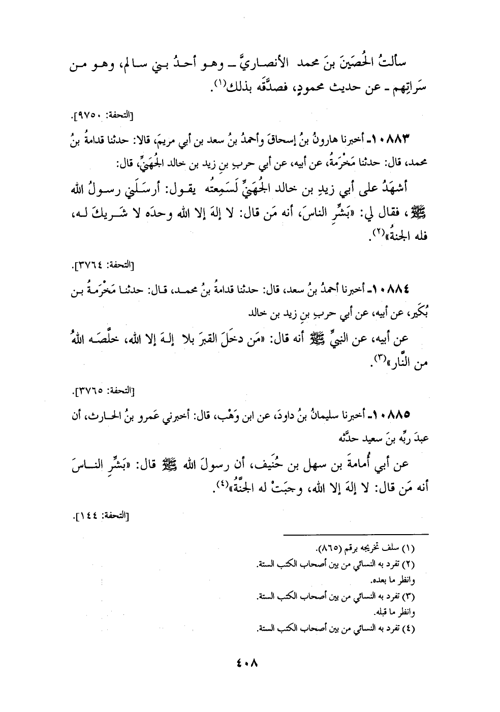 10885 - أَخْبَرَنَا سُلَيْمَانُ بْنُ دَاوُدَ، عَنِ ابْنِ وَهْبٍ، قَالَ: أَخْبَرَنِي عَمْرُو بْنُ الْحَارِثِ، أَنَّ عَبْدَ رَبِّهِ بْنَ سَعِيدٍ، حَدَّثَهٌ، عَنْ أَبِي أُمَامَةَ بْنِ سَهْلِ بْنِ حُنَيْفٍ: أَنَّ رَسُولَ اللهِ صَلَّى اللهُ عَلَيْهِ وَسَلَّمَ قَالَ: " §بَشِّرِ النَّاسَ أَنَّهُ مَنْ قَالَ: لَا إِلَهَ إِلَّا اللهُ وَجَبَتْ لَهُ الْجَنَّةُ "