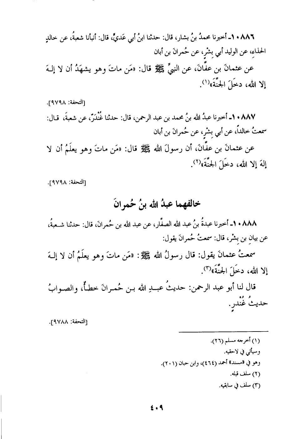 10888 - أَخْبَرَنَا عَبْدَةُ بْنُ عَبْدِ اللهِ الصَّفَارُ، عَنْ عَبْدِ اللهِ بْنِ حُمْرَانَ، قَالَ: حَدَّثَنَا شُعْبَةُ، عَنْ بَيَانَ بْنِ بِشْرٍ، قَالَ: سَمِعْتُ حُمْرَانَ، يَقُولُ: سَمِعْتُ عُثْمَانَ، يَقُولُ: قَالَ رَسُولُ اللهِ صَلَّى اللهُ عَلَيْهِ وَسَلَّمَ: «§مَنْ مَاتَ وَهُو يَعْلَمُ أَنْ لَا إِلَهَ إِلَّا اللهُ دَخَلَ الْجَنَّةَ» قَالَ لَنَا أَبُو عَبْدِ الرَّحْمَنِ: حَدِيثُ عَبْدِ اللهِ بْنِ حُمْرَانَ خَطَأٌ، وَالصَّوَابُ حَدِيثُ غُنْدَرٍ