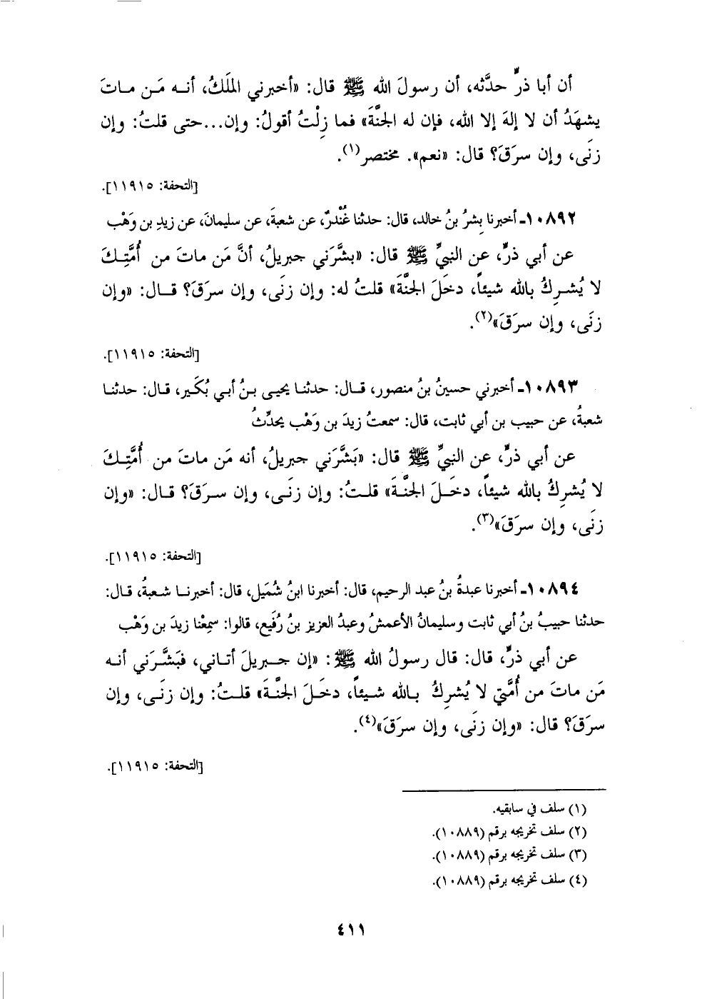 10894 - أَخْبَرَنَا عَبْدَةُ بْنُ عَبْدِ الرَّحِيمِ، قَالَ: أَخْبَرَنَا ابْنُ شُمَيْلٍ، قَالَ: أَخْبَرَنَا شُعْبَةُ، قَالَ: حَدَّثَنَا حَبِيبُ بْنُ أَبِي ثَابِتٍ، وَسُلَيْمَانُ الْأَعْمَشُ، وَعَبْدُ الْعَزِيزِ بْنُ رُفَيْعٍ، قَالُوا: سَمِعْنَا زَيْدَ بْنَ وَهْبٍ، عَنْ أَبِي ذَرٍّ، قَالَ: قَالَ رَسُولُ اللهِ صَلَّى اللهُ عَلَيْهِ وَسَلَّمَ: " إِنَّ جِبْرِيلَ أَتَانِي فَبَشَّرَنِي أَنَّهُ §مَنْ مَاتَ مِنْ أُمَّتِي لَا يُشْرِكُ بِاللهِ شَيْئًا دَخَلَ الْجَنَّةَ، قُلْتُ: «وَإِنْ زَنَى، وَإِنْ سَرَقَ؟» قَالَ: وَإِنْ زَنَى، وَإِنْ سَرَقَ "