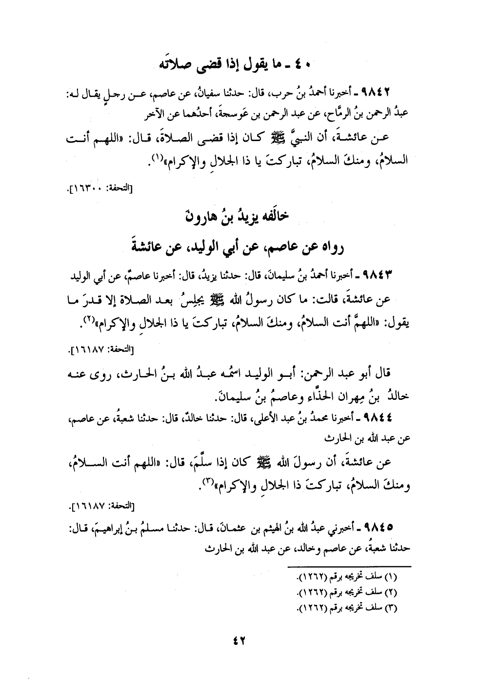 9842 - أَخْبَرَنَا أَحْمَدُ بْنُ حَرْبٍ قَالَ: حَدَّثَنَا سُفْيَانُ، عَنْ عَاصِمٍ، عَنْ رَجُلٍ يُقَالُ لَهُ عَبْدُ الرَّحْمَنِ بْنُ الرَّمَّاحِ، عَنْ عَبْدِ الرَّحْمَنِ بْنِ عَوْسَجَةَ أَحَدُهُمَا عَنِ الْآخَرِ عَنْ عَائِشَةَ، أَنَّ النَّبِيَّ صَلَّى اللهُ عَلَيْهِ وَسَلَّمَ كَانَ إِذَا قَضَى الصَّلَاةَ قَالَ: «اللهُمَّ §أَنْتَ السَّلَامُ وَمِنْكَ السَّلَامُ، تَبَارَكْتَ يَا ذَا الْجِلَالِ وَالْإِكْرَامِ» خَالَفَهُ يَزِيدُ بْنُ هَارُونَ، رَوَاهُ عَنْ عَاصِمٍ، عَنْ أَبِي الْوَلِيدِ، عَنْ عَائِشَةَ