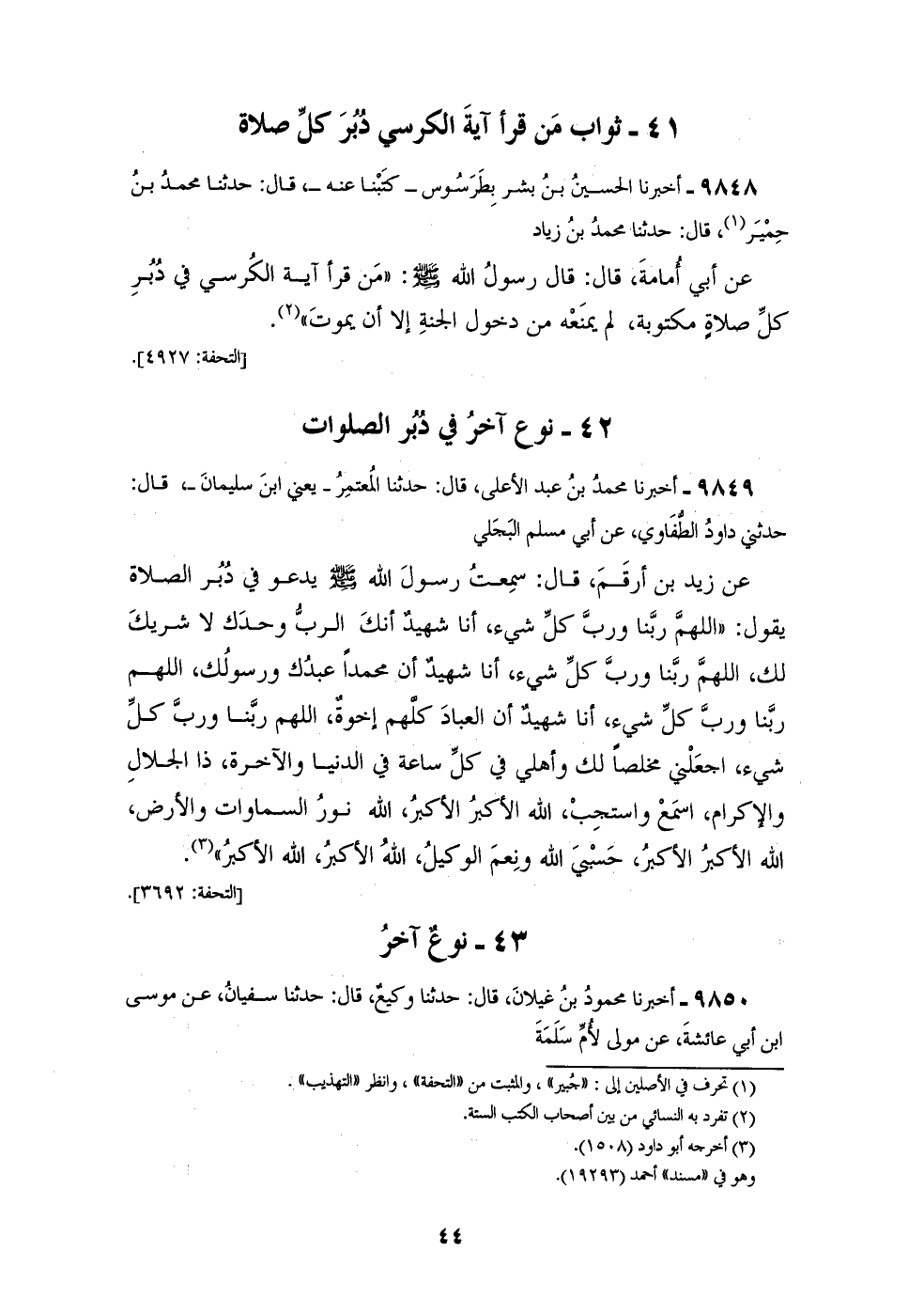 9849 - أَخْبَرَنَا مُحَمَّدُ بْنُ عَبْدِ الْأَعْلَى قَالَ: حَدَّثَنَا الْمُعْتَمِرُ يَعْنِي ابْنَ سُلَيْمَانَ قَالَ: حَدَّثَنِي دَاوُدُ الطُّفَاوِيُّ، عَنْ أَبِي مُسْلِمٍ الْبَجَلِيِّ، عَنْ زَيْدِ بْنِ أَرْقَمَ قَالَ: سَمِعْتُ رَسُولَ اللهِ صَلَّى اللهُ عَلَيْهِ وَسَلَّمَ يَدْعُو فِي دُبُرِ الصَّلَاةِ يَقُولُ: «اللهُمَّ §رَبَّنَا وَرَبَّ كُلِّ شَيْءٍ، أَنَا شَهِيدٌ أَنَّكَ الرَّبُّ، وَحْدَكَ لَا شَرِيكَ لَكَ، اللهُمَّ رَبَّنَا وَرَبَّ كُلِّ شَيْءٍ، أَنَا شَهِيدُ أَنَّ مُحَمَّدًا عَبْدُكَ وَرَسُولُكَ، اللهُمَّ رَبَّنَا وَرَبَّ كُلِّ شَيْءٍ، أَنَا شَهِيدٌ أَنَّ الْعِبَادَ كُلَّهُمُ إخْوَةٌ، اللهُمَّ رَبَّنَا وَرَبَّ كُلِّ شَيْءٍ، اجْعَلْنِي مُخْلَصًا لَكَ وَأهْلِي فِي كُلِّ سَاعَةٍ فِي الدُّنْيَا وَالْآخِرَةِ، ذَا الْجِلَالِ وَالْإِكْرَامِ اسْمَعْ وَاسْتَجِبْ، اللهُ الْأَكْبَرُ الْأَكْبَرُ، اللهُ نُورُ السَّمَوَاتِ وَالْأَرْضِ، اللهُ الْأَكْبَرُ الْأَكْبَرُ حَسْبِيَ اللهُ وَنِعْمَ الْوَكِيلُ، اللهُ الْأَكْبَرُ اللهُ الْأَكْبَرُ»
