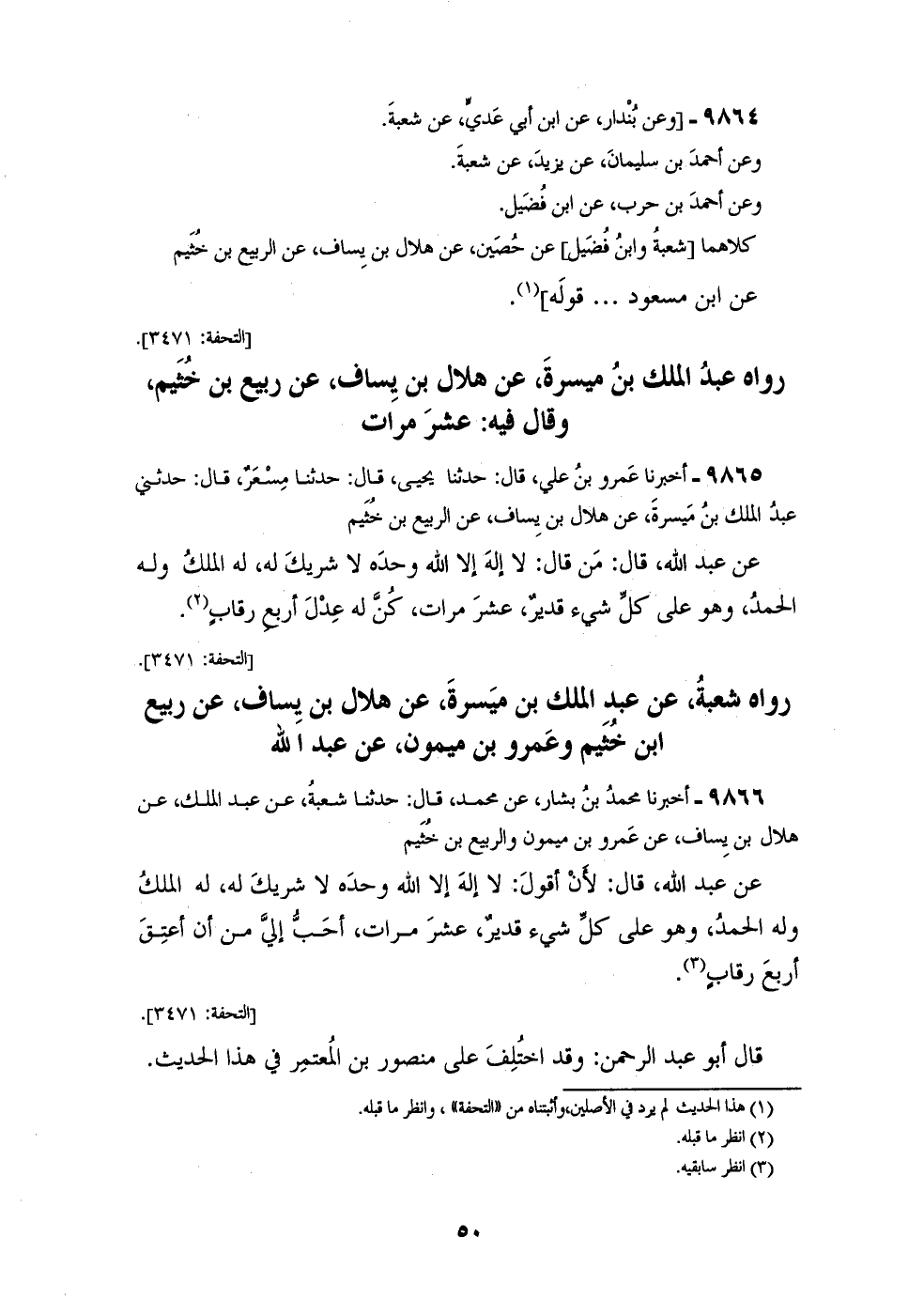 9865 - أَخْبَرَنَا عَمْرُو بْنُ عَلِيٍّ قَالَ: حَدَّثَنَا يَحْيَى قَالَ: حَدَّثَنَا مِسْعَرٌ قَالَ: حَدَّثَنِي عَبْدُ الْمَلِكِ بْنُ مَيْسَرَةَ، عَنْ هِلَالِ بْنِ يَسَافٍ، عَنِ الرَّبِيعِ بْنِ خُثَيْمٍ، عَنْ عَبْدِ اللهِ قَالَ: " مَنْ قَالَ: §لَا إِلَهَ إِلَّا اللهُ، وَحْدَهُ لَا شَرِيكَ لَهُ، لَهُ الْمُلْكُ وَلَهُ الْحَمْدُ، وَهُوَ عَلَى كُلِّ شَيْءٍ قَدِيرٌ، عَشْرَ مَرَّاتٍ كُنَّ لَهُ عَدْلَ أَرْبَعِ رِقَابٍ " رَوَاهُ شُعْبَةُ، عَنْ عَبْدِ الْمَلِكِ بْنِ مَيْسَرَةَ، عَنْ هِلَالِ بْنِ يَسَافٍ، عَنْ رَبِيعِ بْنِ خُثَيْمٍ، وَعَمْرِو بْنِ مَيْمُونٍ، عَنْ عَبْدِ اللهِ