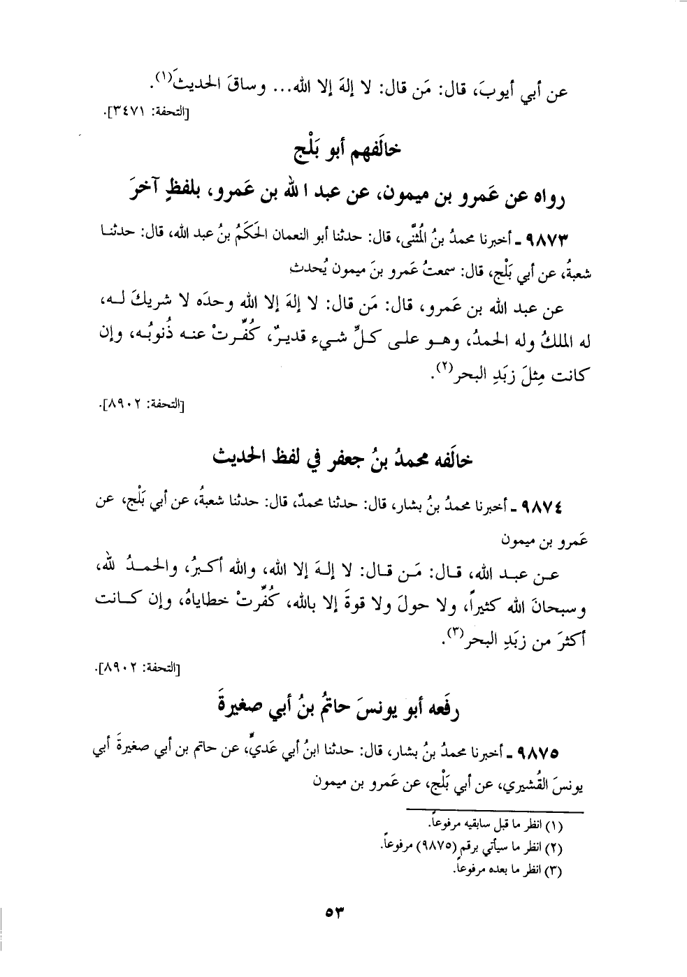 9873 - أَخْبَرَنَا مُحَمَّدُ بْنُ الْمُثَنَّى قَالَ: حَدَّثَنَا أَبُو النُّعْمَانِ الْحَكَمُ بْنُ عَبْدِ اللهِ قَالَ: حَدَّثَنَا شُعْبَةُ، عَنْ أَبِي بَلْجٍ قَالَ: سَمِعْتُ عَمْرَو بْنَ مَيْمُونٍ يُحَدِّثُ عَنْ عَبْدِ اللهِ بْنِ عَمْرٍو قَالَ: " مَنْ قَالَ: §لَا إِلَهَ إِلَّا اللهُ، وَحْدَهُ لَا شَرِيكَ لَهُ، لَهُ الْمُلْكُ وَلَهُ الْحَمْدُ، وَهُوَ عَلَى كُلِّ شَيْءٍ قَدِيرٌ، كُفِّرَتْ عَنْهُ ذُنُوبُهُ وَإنْ كَانَتْ مِثْلَ زَبَدِ الْبَحْرِ " خَالَفَهُ مُحَمَّدُ بْنُ جَعْفَرٍ فِي لَفْظِ الْحَدِيثِ