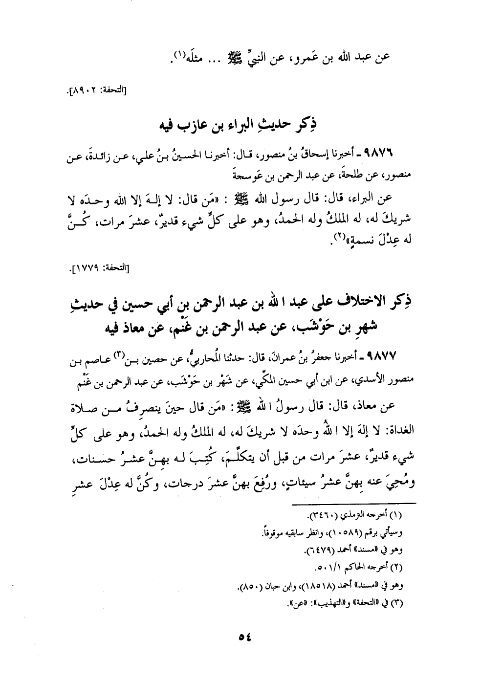 9877 - أَخْبَرَنَا جَعْفَرُ بْنُ عِمْرَانَ قَالَ: حَدَّثَنَا الْمُحَارِبِيُّ، عَنْ حُصَينِ بْنِ عَاصِمِ بْنِ مَنْصُورٍ الْأَسَدِيِّ، عَنِ ابْنِ أَبِي حُسَيْنٍ الْمَكِّيِّ، عَنْ شَهْرِ بْنِ حَوْشَبٍ، عَنْ عَبْدِ الرَّحْمَنِ بْنِ غُنْمٍ، عَنْ مُعَاذٍ قَالَ: قَالَ رَسُولُ اللهِ صَلَّى اللهُ عَلَيْهِ وَسَلَّمَ: " مَنْ قَالَ حِينَ يَنْصَرِفُ مِنْ صَلَاةِ الْغَدَاةِ: §لَا إِلَهَ إِلَّا اللهُ، وَحْدَهُ لَا شَرِيكَ لَهُ، لَهُ الْمُلْكُ وَلَهُ الْحَمْدُ، وَهُوَ عَلَى كُلِّ شَيْءٍ قَدِيرٌ عَشْرَ مَرَّاتٍ مِنْ قَبْلِ أَنْ يَتَكَلَّمَ، كُتِبَ لَهُ بِهِنَّ عَشْرُ حَسَنَاتٍ، وَمُحِيَ عَنْهُ بِهِنَّ عَشْرُ سَيِّئَاتٍ، وَرُفِعَ بِهِنَّ عَشْرَ دَرَجَاتٍ، وَكُنَّ لَهُ عَدْلَ عَشْرِ نَسَمَاتٍ، وَكُنَّ لَهُ حَرَسًا مِنَ الشَّيْطَانِ، وَحِرْزًا مِنَ الْمَكْرُوهِ، وَلَمْ يَلْحَقْهُ فِي يَوْمِهِ ذَلِكَ ذَنْبُ إِلَّا الشِّرْكُ بِاللهِ، وَمَنْ قَالَهُنَّ حِينَ يَنْصَرِفُ مِنْ صَلَاةِ الْعَصْرِ أُعْطِيَ مِثْلَ ذَلِكَ فِي لَيْلَتِهِ " قَالَ أَبُو عَبْدِ الرَّحْمَنِ: حُصَينُ بْنُ عَاصِمٍ مَجْهُولٌ، وَشَهْرُ بْنُ حَوْشَبٍ ضَعِيفٌ، سُئِلَ ابْنُ عَوْنٍ عَنْ حَدِيثِ شَهْرٍ فَقَالَ: إنَّ شَهْرًا نَزَكُوهُ، وَكَانَ شُعْبَةُ سَيِّئَ الرَّأْيِ فِيهِ، وَتَرَكَهُ يَحْيَى الْقَطَّانُ -[55]-، خَالَفَهُ زَيْدُ بْنُ أَبِي أُنَيْسَةَ، رَوَاهُ عَنِ ابْنِ أَبِي حُسَيْنٍ، عَنْ شَهْرٍ، عَنْ عَبْدِ الرَّحْمَنِ بْنِ غُنْمٍ، عَنْ أَبِي ذَرٍّ