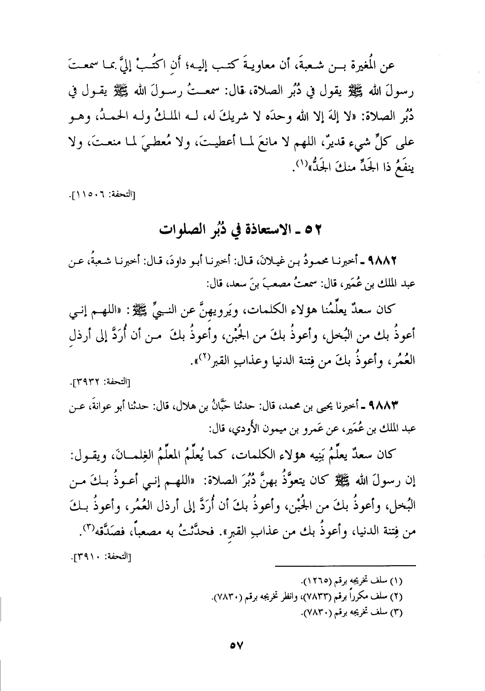 9883 - أَخْبَرَنَا يَحْيَى بْنُ مُحَمَّدٍ قَالَ: حَدَّثَنَا حَبَّانُ بْنُ هِلَالٍ قَالَ: حَدَّثَنَا أَبُو عَوَانَةَ، عَنْ عَبْدِ الْمَلِكِ بْنِ عُمَيْرٍ، عَنْ عَمْرِو بْنِ مَيْمُونٍ الْأَوْدِيِّ قَالَ: كَانَ سَعْدٌ يُعَلِّمُ بَنِيهِ هَؤُلَاءِ الْكَلِمَاتِ كَمَا يُعَلِّمُ الْمُعَلِّمُ الْغِلْمَانَ وَيَقُولُ: إنَّ رَسُولَ اللهِ صَلَّى اللهُ عَلَيْهِ وَسَلَّمَ كَانَ يَتَعَوَّذُ بِهِنَّ دُبُرَ الصَّلَاةِ: «اللهُمَّ إِنِّي §أَعُوذُ بِكَ مِنَ الْبُخْلِ، وَأَعُوذُ بِكَ مِنَ الْجُبْنِ، وَأَعُوذُ بِكَ أَنْ أُرَدَّ إِلَى أَرْذَلِ الْعُمُرِ، وَأَعُوذُ بِكَ مِنْ فِتْنَةِ الدُّنْيَا، وَأَعُوذُ بِكَ مِنْ عَذَابِ الْقَبْرِ» فَحَدَّثْتُ بِهِ مُصْعَبًا فَصَدَّقَهُ -[58]-، خَالَفَهُ أَبُو إِسْحَاقَ، رَوَاهُ عَنْ عَمْرِو بْنِ مَيْمُونٍ، عَنْ عَبْدِ اللهِ