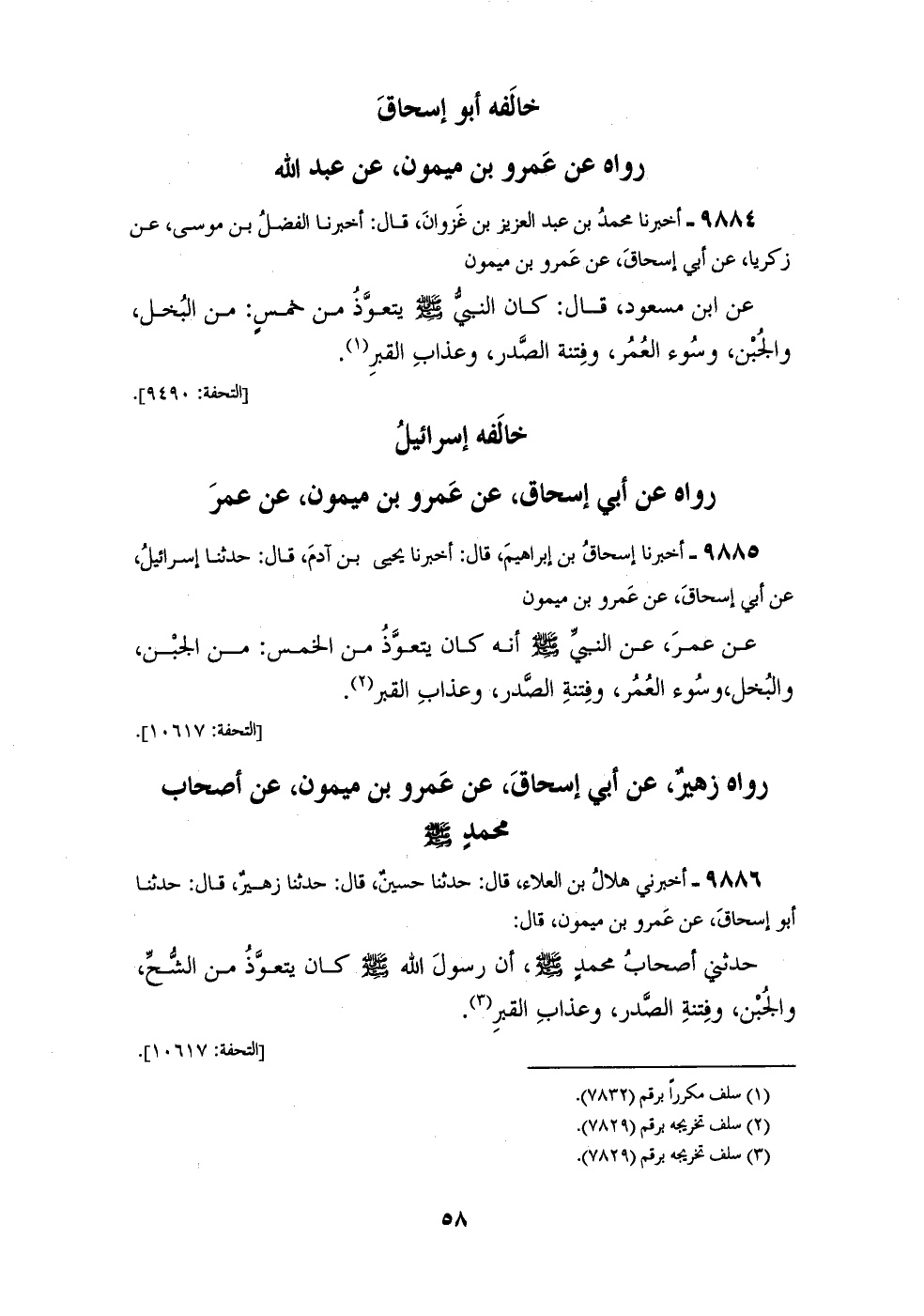 9885 - أَخْبَرَنَا إِسْحَاقُ بْنُ إِبْرَاهِيمَ قَالَ: أَخْبَرَنَا يَحْيَى بْنُ آدَمَ قَالَ: حَدَّثَنَا إِسْرَائِيلُ، عَنْ أَبِي إِسْحَاقَ، عَنْ عَمْرِو بْنِ مَيْمُونٍ، عَنْ عُمَرَ عَنِ النَّبِيِّ صَلَّى اللهُ عَلَيْهِ وَسَلَّمَ: " أَنَّهُ كَانَ §يَتَعَوَّذُ مِنَ الْخَمْسِ: مِنَ الْجُبْنِ، وَالْبُخْلِ، وَسُوءِ، الْعُمُرِ، وَفِتْنَةِ الصَّدْرِ، وَعَذَابِ الْقَبْرِ " رَوَاهُ زُهَيْرٌ، عَنْ أَبِي إِسْحَاقَ، عَنْ عَمْرِو بْنِ مَيْمُونٍ، عَنْ أَصْحَابِ مُحَمَّدٍ صَلَّى اللهُ عَلَيْهِ وَسَلَّمَ