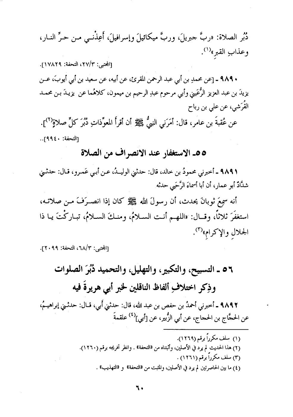 9891 - أَخْبَرَنِي مَحْمُودُ بْنُ خَالِدٍ قَالَ: حَدَّثَنِي الْوَلِيدُ، عَنْ أَبِي عَمْرٍو قَالَ: حَدَّثَنِي شَدَّادٌ أَبُو عَمَّارٍ، أَنَّ أَبَا أَسْمَاءٍ الرَّحَبِيَّ حَدَّثَهُ أَنَّهُ سَمِعَ ثَوْبَانَ، يُحَدِّثُ، أَنَّ رَسُولَ اللهِ صَلَّى اللهُ عَلَيْهِ وَسَلَّمَ كَانَ إِذَا انْصَرَفَ مِنْ صَلَاتِهِ اسْتَغْفَرَ ثَلَاثًا وَقَالَ: «اللهُمَّ §أَنْتَ السَّلَامُ وَمِنْكَ السَّلَامُ، تَبَارَكْتَ يَا ذَا الْجِلَالِ وَالْإِكْرَامِ»