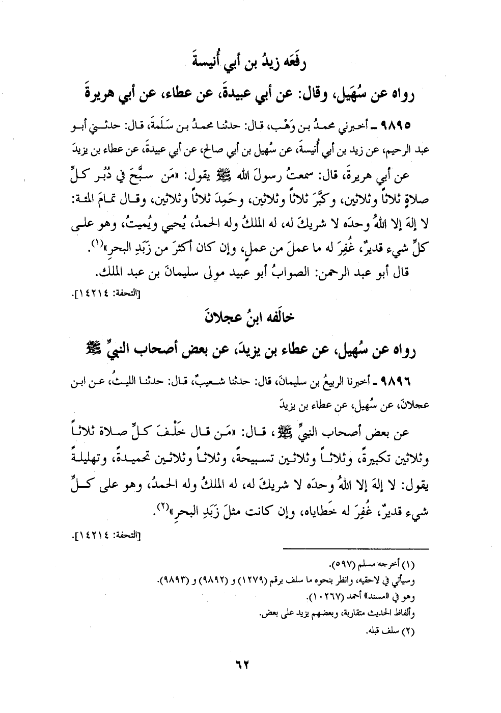 9895 - أَخْبَرَنِي مُحَمَّدُ بْنُ وَهْبٍ قَالَ: حَدَّثَنَا مُحَمَّدُ بْنُ سَلَمَةَ قَالَ: حَدَّثَنِي أَبُو عَبْدِ الرَّحِيمِ، عَنْ زَيْدِ بْنِ أَبِي أُنَيْسَةَ، عَنْ سُهَيْلِ بْنِ أَبِي صَالِحٍ، عَنْ أَبِي عُبَيْدَةَ، عَنْ عَطَاءِ بْنِ يَزِيدَ، عَنْ أَبِي هُرَيْرَةَ قَالَ: سَمِعْتُ رَسُولَ اللهِ صَلَّى اللهُ عَلَيْهِ وَسَلَّمَ يَقُولُ: " مَنْ §سَبَّحَ فِي دُبُرِ كُلِّ صَلَاةٍ ثَلَاثًا وَثَلَاثِينَ، وَكَبَّرَ ثَلَاثًا وَثَلَاثِينَ، وَحَمِدَ ثَلَاثًا وَثَلَاثِينَ، وَقَالَ تَمَامَ الْمِائَةِ: لَا إِلَهَ إِلَّا اللهُ، وَحْدَهُ لَا شَرِيكَ لَهُ، لَهُ الْمُلْكُ وَلَهُ الْحَمْدُ، يُحْيِي وَيُمِيتُ، وَهُوَ عَلَى كُلِّ شَيْءٍ قَدِيرٌ، غُفِرَ لَهُ مَا عَمِلَ مِنْ عُمِلٍ وَإنْ كَانَ أَكْثَرَ مِنْ زَبَدِ الْبَحْرِ " قَالَ أَبُو عَبْدِ الرَّحْمَنِ: الصَّوَابُ أَبُو عُبَيْدٍ مَوْلَى سُلَيْمَانَ بْنِ عَبْدِ الْمَلِكِ، خَالَفَهُ ابْنُ عَجْلَانَ، رَوَاهُ عَنْ سُهَيْلٍ، عَنْ عَطَاءِ بْنِ يَزِيدَ، عَنْ بَعْضِ أَصْحَابِ النَّبِيِّ صَلَّى اللهُ عَلَيْهِ وَسَلَّمَ