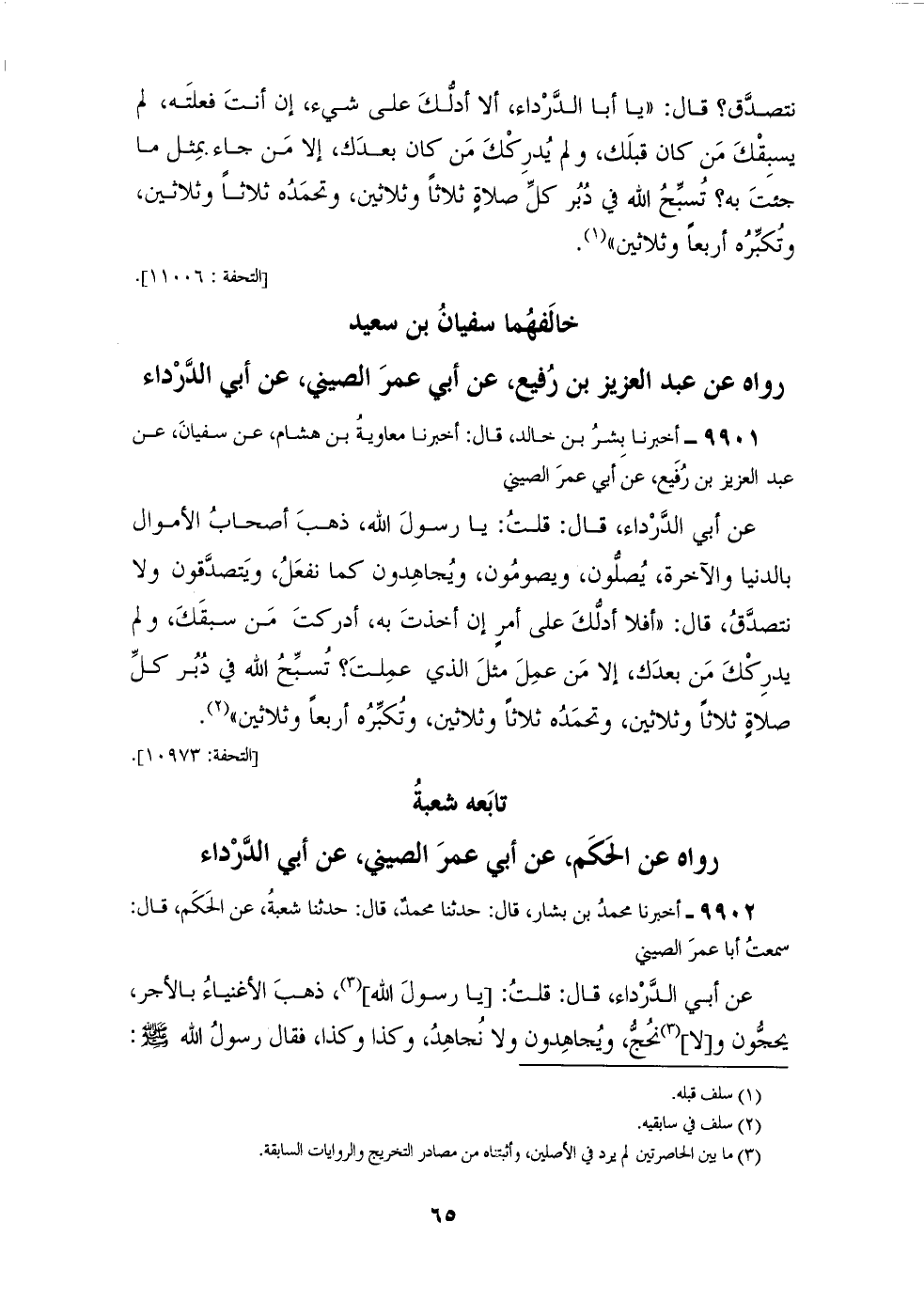 9901 - أَخْبَرَنَا بِشْرُ بْنُ خَالِدٍ قَالَ: أَخْبَرَنَا مُعَاوِيَةُ بْنُ هِشَامٍ، عَنْ سُفْيَانَ، عَنْ عَبْدِ الْعَزِيزِ بْنِ رُفَيْعٍ، عَنْ أَبِي عُمَرَ الصِّينِيِّ، عَنْ أَبِي الدَّرْدَاءِ قَالَ: قُلْتُ: يَا رَسُولَ اللهِ، ذَهَبَ أَصْحَابُ الْأَمْوَالِ بِالدُّنْيَا وَالْآخِرَةِ، يُصَلُّونَ وَيَصُومُونَ وَيُجَاهِدُونَ كَمَا نَفْعَلُ، وَيَتَصَدَّقُونَ وَلَا نَتَصَدَّقُ؟ قَالَ: «§أَفَلَا أَدُلُّكَ عَلَى أَمْرٍ إنْ أَخَذْتَ بِهِ أَدْرَكْتَ مَنْ سَبَقَكَ، وَلَمْ يُدْرِكْكَ مَنْ بَعْدَكَ إِلَّا مَنْ عَمِلَ مِثْلَ الَّذِي عَمِلْتَ؟ تُسَبِّحُ اللهَ فِي دُبُرِ كُلِّ صَلَاةٍ ثَلَاثًا وَثَلَاثِينَ، وَتَحْمَدُهُ ثَلَاثًا وَثَلَاثِينَ، وَتُكَبِّرُهُ أَرْبَعًا وَثَلَاثِينَ» تَابَعَهُ شُعْبَةُ، رَوَاهُ عَنِ الْحَكَمِ، عَنْ أَبِي عُمَرَ الصِّينِيِّ، عَنْ أَبِي الدَّرْدَاءِ
