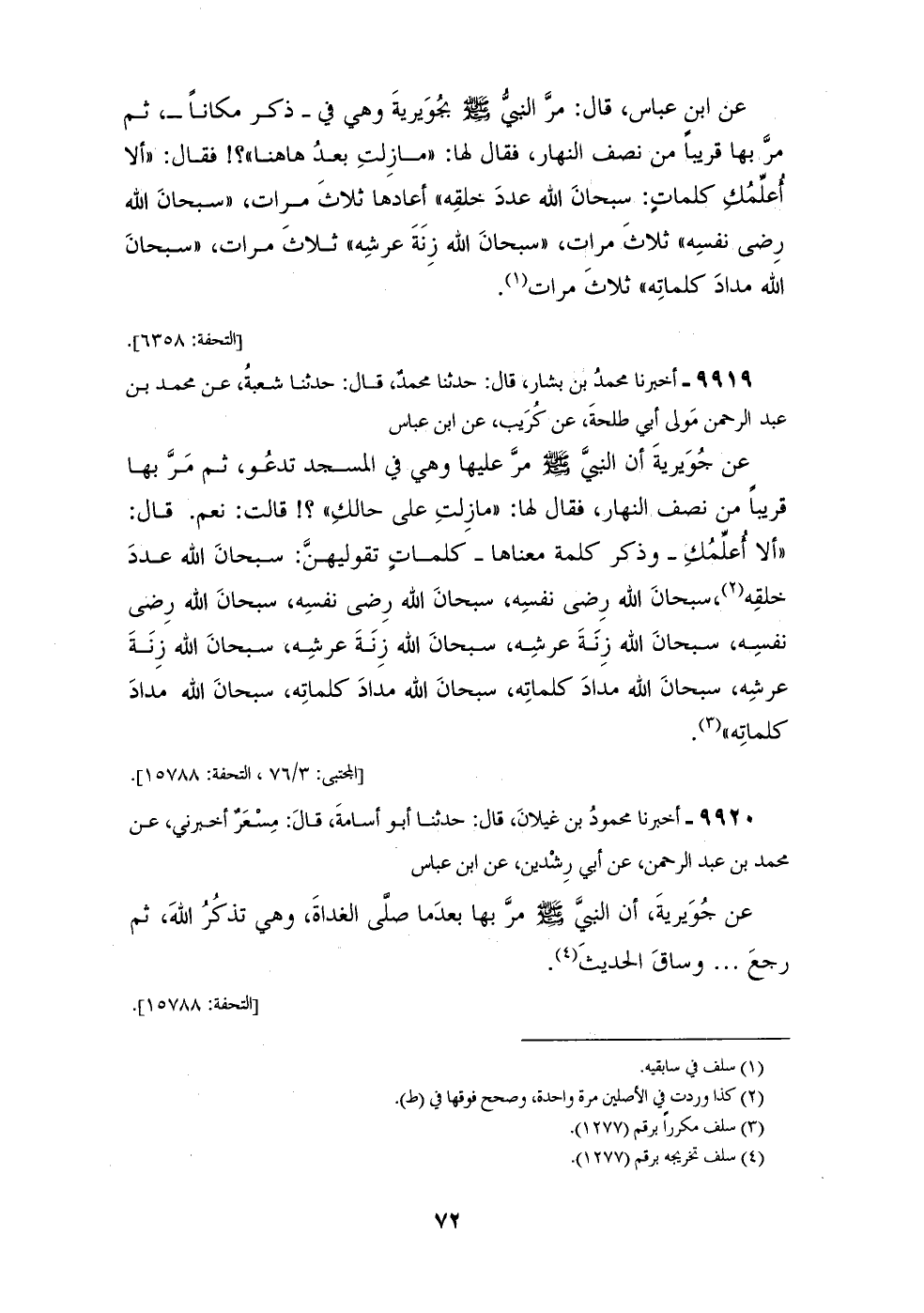 9919 - أَخْبَرَنَا مُحَمَّدُ بْنُ بَشَّارٍ قَالَ: حَدَّثَنَا مُحَمَّدٌ قَالَ: حَدَّثَنَا شُعْبَةُ، عَنْ مُحَمَّدِ بْنِ عَبْدِ الرَّحْمَنِ مَوْلَى أَبِي طَلْحَةَ، عَنْ كُرَيْبٍ، عَنِ ابْنِ عَبَّاسٍ، عَنْ جُوَيْرِيَةَ أَنَّ النَّبِيَّ صَلَّى اللهُ عَلَيْهِ وَسَلَّمَ مَرَّ عَلَيْهَا وَهِيَ فِي الْمَسْجِدِ تَدْعُو، ثُمَّ مَرَّ بِهَا قَرِيبًا مِنْ نِصْفِ النَّهَارِ فَقَالَ لَهَا: «مَا زِلْتِ عَلَى حَالِكِ؟» قَالَتْ: نَعَمْ قَالَ: " §ألَا أُعَلِّمُكِ، وَذَكَرَ كَلِمَةً مَعْنَاهَا: كَلِمَاتٍ تَقُولِيهِنَّ: سُبْحَانَ اللهِ عَدَدَ خَلْقِهِ، سُبْحَانَ اللهِ رِضَى نَفْسِهِ، سُبْحَانَ اللهِ رِضَى نَفْسِهِ، سُبْحَانَ اللهِ رِضَى نَفْسِه، سُبْحَانَ اللهِ زِنَةَ عَرْشِهِ، سُبْحَانَ اللهِ زِنَةَ عَرْشِهِ، سُبْحَانَ اللهِ زِنَةَ عَرْشِهِ، سُبْحَانَ اللهِ مِدَادَ كَلِمَاتِهِ، سُبْحَانَ اللهِ مِدَادَ كَلِمَاتِهِ، سُبْحَانَ اللهِ مِدَادَ كَلِمَاتِهِ "