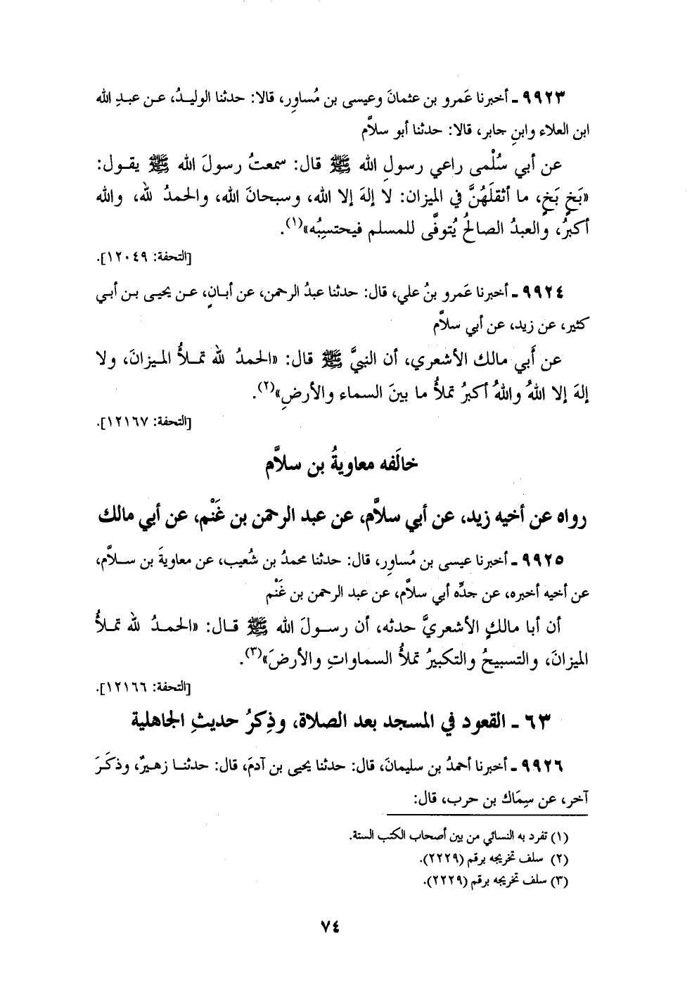 9925 - أَخْبَرَنَا عِيسَى بْنُ مُسَاوِرٍ قَالَ: حَدَّثَنَا مُحَمَّدُ بْنُ شُعَيْبٍ، عَنْ مُعَاوِيَةَ بْنِ سَلَامٍ، عَنْ أَخِيهِ، أَخْبَرَهُ، عَنْ جَدِّهِ أَبِي سَلَامٍ، عَنْ عَبْدِ الرَّحْمَنِ بْنِ غُنْمٍ: أَنَّ أَبَا مَالِكٍ الْأَشْعَرِيَّ، حَدَّثَهُ أَنَّ رَسُولَ اللهِ صَلَّى اللهُ عَلَيْهِ وَسَلَّمَ قَالَ: «§الْحَمْدُ لِلَّهِ تَمْلَأُ الْمِيزَانَ، وَالتَّسْبِيحُ وَالتَّكْبِيرُ تَمْلَأُ السَّمَوَاتِ وَالْأَرْضَ»