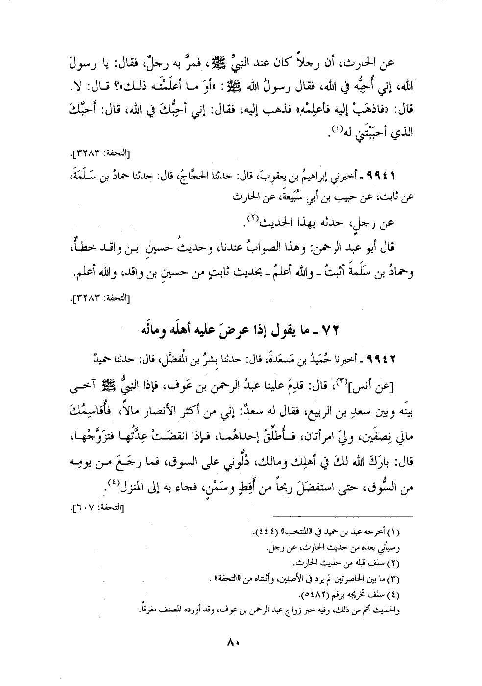 9942 - أَخْبَرَنَا حُمَيْدُ بْنُ مَسْعَدَةَ قَالَ: حَدَّثَنَا بِشْرُ بْنُ الْمُفَضَّلِ قَالَ: حَدَّثَنَا حُمَيْدٌ قَالَ: قَدِمَ عَلَيْنَا عَبْدُ الرَّحْمَنِ بْنُ عَوْفٍ، فَإِذَا النَّبِيُّ صَلَّى اللهُ عَلَيْهِ وَسَلَّمَ آخَى بَيْنَهُ وَبَيْنَ سَعْدِ بْنِ الرَّبِيعِ، فَقَالَ لَهُ سَعْدٌ: إِنِّي مِنْ أَكْثَرِ الْأَنْصَارِ مَالًا، فَأُقَاسِمُكَ مَالِي نِصْفَيْنِ، وَلِيَ امْرَأَتَانِ، فَأُطَلِّقُ إِحْدَاهُمَا، فَإِذَا انْقَضَتْ عِدَّتُهَا فَتَزَوَّجْهَا، قَالَ: بَارَكَ اللهُ لَكَ فِي أَهْلِكَ وَمَالِكَ، §دُلُّونِي عَلَى السُّوقِ، فَمَا رَجَعَ يَوْمَهُ مِنَ السُّوقِ حَتَّى اسْتَفْضَلَ رِبْحًا مِنْ أَقِطٍ وَسَمْنٍ، فَجَاءَ بِهِ إِلَى الْمَنْزِلِ "