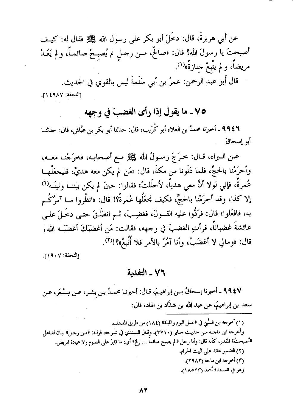 9946 - أَخْبَرَنَا مُحَمَّدُ بْنُ الْعَلَاءِ أَبُو كُرَيْبٍ قَالَ: حَدَّثَنَا أَبُو بَكْرِ بْنِ عَيَّاشٍ قَالَ: حَدَّثَنَا أَبُو إِسْحَاقَ، عَنِ الْبَرَاءِ قَالَ: خَرَجَ رَسُولُ اللهِ صَلَّى اللهُ عَلَيْهِ وَسَلَّمَ مَعَ أَصْحَابِهِ فَخَرَجْنَا مَعَهُ، وَأَحْرَمْنَا بِالْحَجِّ، فَلَمَّا دَنَوْنَا مِنْ مَكَّةَ قَالَ: «§مَنْ لَمْ يَكُنْ مَعَهُ هَدْيٌ فَلْيَجْعَلْهَا عَمْرَةً، فَإِنِّي لَوْلَا أَنَّ مَعِي هَدْيًا لَأَحْلَلْتُ» فَقَالُوا: حِينَ لَمْ يَكُنْ بَيْنَنَا وَبَيْنَهُ إِلَّا كَذَا وَقَدْ أَحْرَمْنَا بِالْحَجِّ، فَكَيْفَ نَجْعَلُهَا عَمْرَةً؟ قَالَ: «انْظُرُوا مَا آمُرُكُمْ بِهِ فَافْعَلُوا» قَالَ: فَرَدُّوا عَلَيْهِ الْقَوْلَ فَغَضِبَ، ثُمَّ انْطَلَقَ حَتَّى دَخَلَ عَلَى عَائِشَةَ غَضْبَانًا، فَرَأَتِ الْغَضَبَ فِي وَجْهِهِ فَقَالَتْ: مَنْ أَغْضَبَكَ أَغْضَبَهُ اللهُ قَالَ: «وَمَا لِي لَا أَغْضَبُ وَأَنَا آمُرُ بِالْأَمْرِ فَلَا أُتْبَعُ»