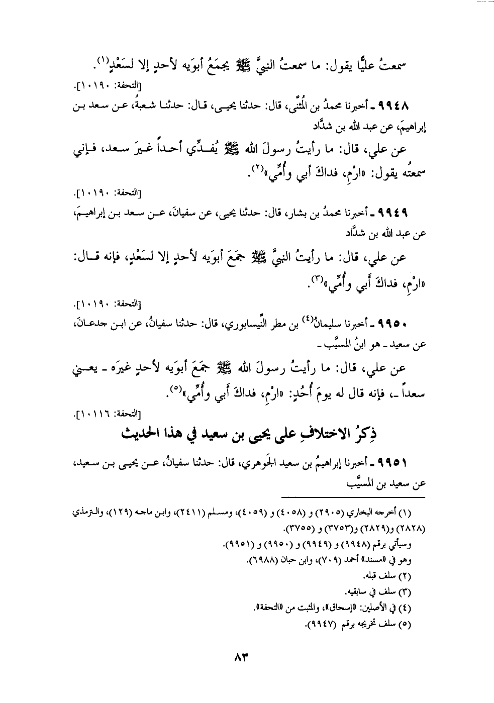 9951 - أَخْبَرَنَا إِبْرَاهِيمُ بْنُ سَعِيدٍ الْجَوْهَرِيُّ قَالَ: حَدَّثَنَا سُفْيَانُ، عَنْ يَحْيَى بْنِ سَعِيدٍ، عَنْ سَعِيدِ بْنِ الْمُسَيِّبِ، عَنْ عَلِيٍّ قَالَ: مَا سَمِعْتُ النَّبِيَّ صَلَّى اللهُ عَلَيْهِ وَسَلَّمَ §يَجْمَعُ أَبَوَيْهِ لِأَحَدٍ غَيْرِ سَعْدٍ "