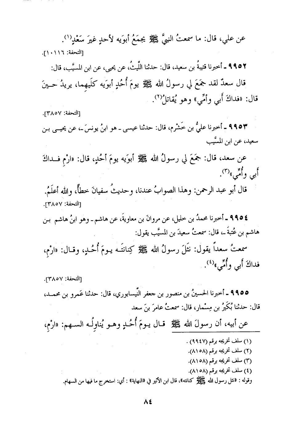 9953 - أَخْبَرَنَا عَلِيُّ بْنُ خَشْرَمٍ قَالَ: حَدَّثَنَا عِيسَى هُوَ ابْنُ يُونُسَ، عَنْ يَحْيَى بْنِ سَعِيدٍ، عَنِ ابْنِ الْمُسَيَّبِ، عَنْ سَعْدٍ قَالَ: جَمَعَ لِي رَسُولُ اللهِ صَلَّى اللهُ عَلَيْهِ وَسَلَّمَ أَبَوَيْهِ يَوْمَ أُحُدٍ قَالَ: «§ارْمِ، فِدَاكَ أَبِي وَأُمِّي» قَالَ أَبُو عَبْدِ الرَّحْمَنِ: وَهَذَا الصَّوَابُ عِنْدَنَا، وَحَدِيثُ سُفْيَانَ خَطَأٌ، وَاللهُ أَعْلَمُ