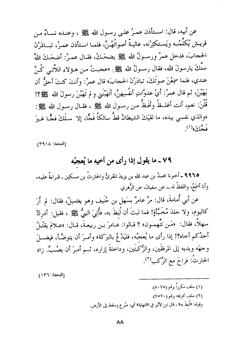 9965 - أَخْبَرَنَا مُحَمَّدُ بْنُ عَبْدِ اللهِ بْنِ يَزِيدَ الْمُقْرِئُ، وَالْحَارِثُ بْنُ مِسْكِينٍ قِرَاءَةً عَلَيْهِ وَأَنَا أَسْمَعُ وَاللَّفْظُ لَهُ عَنْ سُفْيَانَ، عَنِ الزُّهْرِيِّ، عَنْ أَبِي أُمَامَةَ قَالَ: مَرَّ عَامِرٌ بِسَهْلِ بْنِ حُنَيْفٍ وَهُوَ يَغْتَسِلُ فَقَالَ: لَمْ أَرَ كَالْيَوْمِ وَلَا جِلْدَ مُخَبَّأَةٍ، فَمَا لَبِثَ أَنْ لَبِطَ بِهِ، فَأَتَى النَّبِيَّ صَلَّى اللهُ عَلَيْهِ وَسَلَّمَ فَقِيلَ: أَدْرِكْ سَهْلًا فَقَالَ: «مَنْ تَتَّهِمُونَ؟» قَالُوا: عَامِرُ بْنُ رَبِيعَةَ قَالَ: «§عَلَّامَ يَقْتَلُ أَحَدُكُمْ أَخَاهُ؟ إِذَا رَأَى مَا يُعْجِبُهُ فَلْيَدْعُ بِالْبَرَكَةِ» وَأَمَرَ أَنْ يَتَوَضَّأَ فَيَغْسِلَ وَجْهَهُ وَيَدَيْهِ إِلَى الْمِرْفَقَيْنِ، وَالرُّكْبَتَيْنِ، وَدَاخِلَةَ إِزَارِهِ، ثُمَّ أَمَرَ أَنْ يَصُبَّ، زَادَ الْحَارِثُ: فَرَاحَ مَعَ الرَّكْبِ
