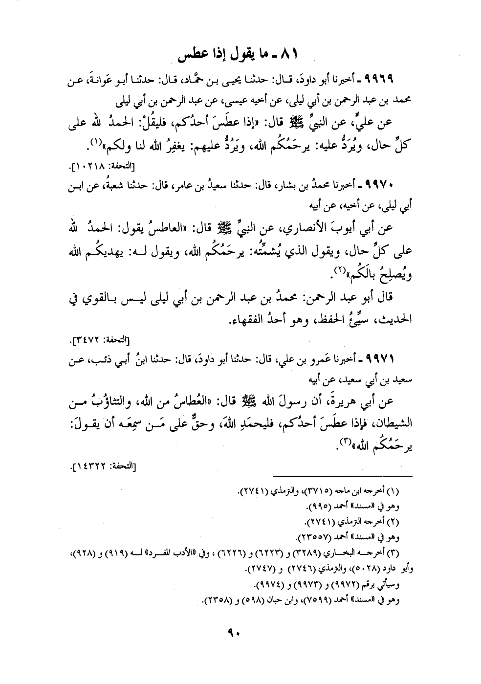 9969 - أَخْبَرَنَا أَبُو دَاوُدَ قَالَ: حَدَّثَنَا يَحْيَى بْنُ حَمَّادٍ قَالَ: حَدَّثَنَا أَبُو عَوَانَةَ، عَنْ مُحَمَّدِ بْنِ عَبْدِ الرَّحْمَنِ بْنِ أَبِي لَيْلَى، عَنْ أَخِيهِ عِيسَى، عَنْ عَبْدِ الرَّحْمَنِ بْنِ أَبِي لَيْلَى، عَنْ عَلِيٍّ عَنِ النَّبِيِّ صَلَّى اللهُ عَلَيْهِ وَسَلَّمَ قَالَ: " إِذَا §عَطَسَ أَحَدُكُمْ فَلْيَقُلِ: الْحَمْدُ لِلَّهِ عَلَى كُلِّ حَالٍ، وَيُرَدُّ عَلَيْهِ: يَرْحَمُكُمُ اللهُ، وَيُرَدُّ عَلَيْهِمْ: يَغْفِرُ اللهُ لَنَا وَلَكُمْ "