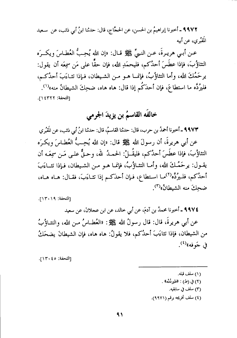 9973 - أَخْبَرَنَا أَحْمَدُ بْنُ حَرْبٍ قَالَ: حَدَّثَنَا الْقَاسِمُ قَالَ: حَدَّثَنَا ابْنُ أَبِي ذِئْبٍ، عَنِ الْمَقْبُرِيِّ، عَنْ أَبِي هُرَيْرَةَ: أَنَّ رَسُولَ اللهِ صَلَّى اللهُ عَلَيْهِ وَسَلَّمَ قَالَ: " إنَّ §اللهَ يُحِبُّ الْعُطَاسَ وَيَكْرَهُ التَّثَاؤُبَ، فَإِذَا عَطَسَ أَحَدُكُمْ فَلْيَقُلِ: الْحَمْدُ لِلَّهِ، وَحَقٌّ عَلَى مَنْ سَمِعَهُ أَنْ يَقُولَ: يَرْحَمُكَ اللهُ، وَأَمَّا التَّثَاؤُبُ فَإِنَّمَا هُوَ مِنَ الشَّيْطَانِ، فَإِذَا تَثَاءَبَ أَحَدُكُمْ فَلْيَرُدَّهُ مَا اسْتَطَاعَ، فَإِنَّ أَحَدَكُمْ إِذَا تَثَاءَبَ فَقَالَ: هَاهْ هَاهْ، ضَحِكَ مِنْهُ الشَّيْطَانُ "