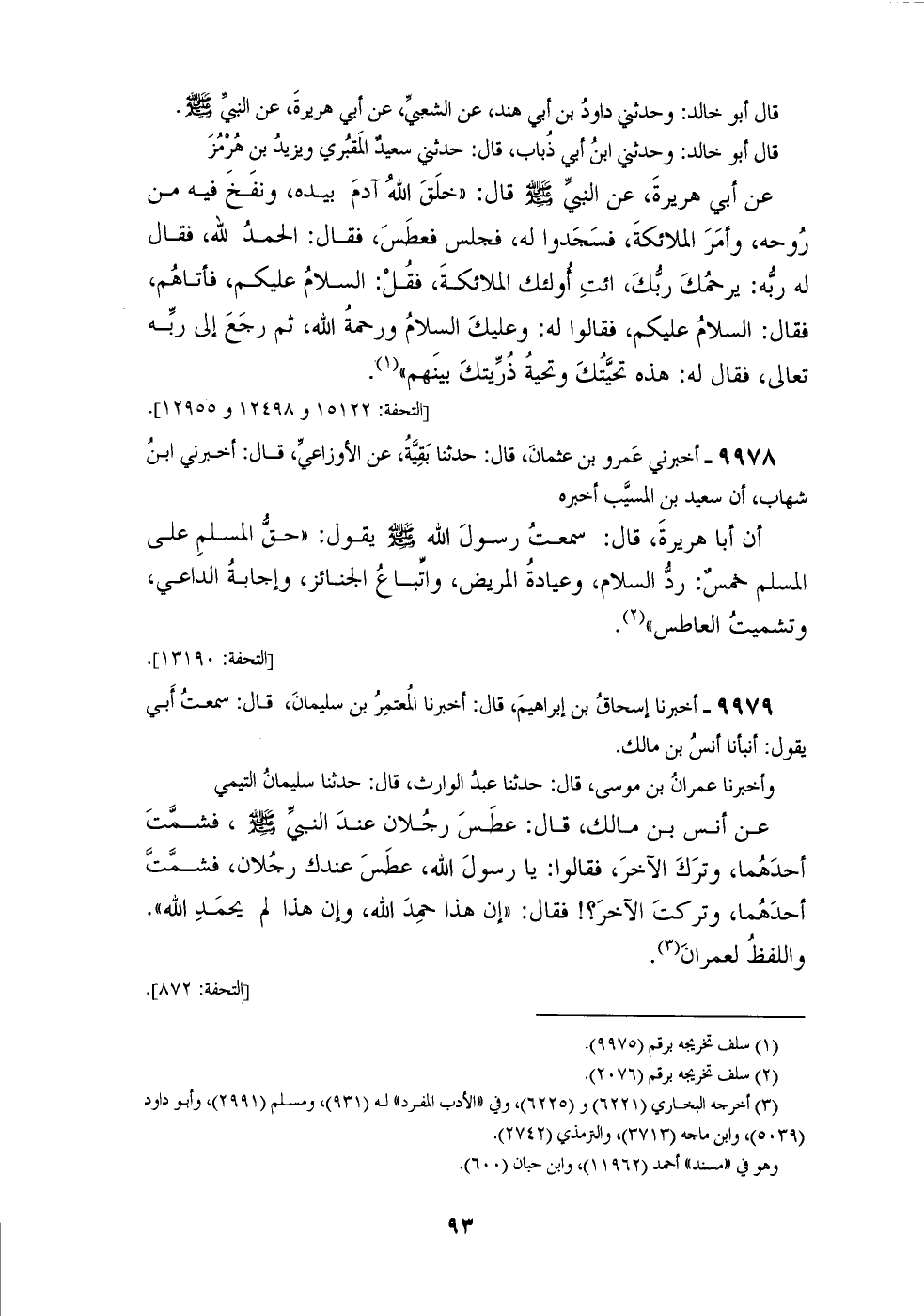 9977 - أَخْبَرَنَا مُحَمَّدُ بْنُ خَلَفٍ قَالَ: حَدَّثَنَا آدَمُ قَالَ: حَدَّثَنَا أَبُو خَالِدٍ سُلَيْمَانُ بْنُ حَيَّانَ قَالَ: حَدَّثَنِي مُحَمَّدُ بْنُ عَمْرٍو، عَنْ أَبِي سَلَمَةَ، عَنْ أَبِي هُرَيْرَةَ عَنِ النَّبِيِّ صَلَّى اللهُ عَلَيْهِ وَسَلَّمَ، قَالَ أَبُو خَالِدٍ: وَحَدَّثَنَا الْأَعْمَشُ، عَنْ أَبِي صَالِحٍ، عَنْ أَبِي هُرَيْرَةَ عَنِ النَّبِيِّ صَلَّى اللهُ عَلَيْهِ وَسَلَّمَ قَالَ أَبُو خَالِدٍ: وَحَدَّثَنِي دَاوُدُ بْنُ أَبِي هِنْدٍ، عَنِ الشَّعْبِيِّ، عَنْ أَبِي هُرَيْرَةَ، عَنِ النَّبِيِّ صَلَّى اللهُ عَلَيْهِ وَسَلَّمَ قَالَ أَبُو خَالِدٍ: وَحَدَّثَنِي ابْنُ أَبِي ذُبَابٍ قَالَ: حَدَّثَنِي سَعِيدٌ الْمَقْبُرِيُّ، وَيَزِيدُ بْنُ هُرْمُزٍ، عَنْ أَبِي هُرَيْرَةَ عَنِ النَّبِيِّ صَلَّى اللهُ عَلَيْهِ وَسَلَّمَ قَالَ: " §خَلَقَ اللهُ آدَمَ بِيَدِهِ، وَنَفَخَ فِيهِ مِنْ رُوحِهِ، وَأَمَرَ الْمَلَائِكَةَ فَسَجَدُوا لَهُ، فَجَلَسَ فَعَطَسَ، فَقَالَ: الْحَمْدُ لِلَّهِ فَقَالَ لَهُ رَبُّهُ: يَرْحَمُكَ رَبُّكَ، ائْتِ أُولَئِكَ الْمَلَائِكَةَ فَقُلِ: السَّلَامُ عَلَيْكُمْ، فَأَتَاهُمْ فَقَالَ: السَّلَامُ عَلَيْكُمْ، فَقَالُوا لَهُ: وَعَلَيْكَ السَّلَامُ وَرَحْمَةُ اللهِ، ثُمَّ رَجَعَ إِلَى رَبِّهِ تَعَالَى فَقَالَ لَهُ: هَذِهِ تَحِيَّتُكَ وَتَحِيَّةُ ذُرِّيَّتِكَ بَيْنَهُمْ "