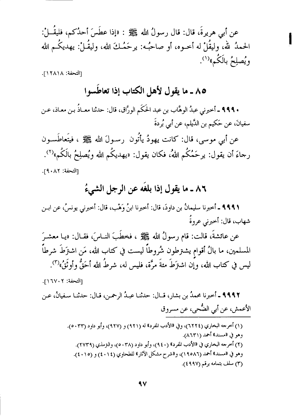 9990 - أَخْبَرَنِي عَبْدُ الْوَهَّابِ بْنُ عَبْدِ الْحَكَمِ الْوَرَّاقُ قَالَ: حَدَّثَنَا مُعَاذُ بْنُ مُعَاذٍ، عَنْ سُفْيَانَ، عَنْ حَكِيمِ بْنِ الدَّيْلَمِ، عَنْ أَبِي بُرْدَةَ، عَنْ أَبِي مُوسَى قَالَ: كَانَتْ يَهُودُ يَأْتُونَ رَسُولَ اللهِ صَلَّى اللهُ عَلَيْهِ وَسَلَّمَ فَيَتَعَاطَسُونَ رَجَاءَ أَنْ يَقُولَ: يَرْحَمُكُمُ اللهُ، فَكَانَ يَقُولُ: «§يَهْدِيكُمُ اللهُ وَيُصْلِحُ بَالَكُمْ»