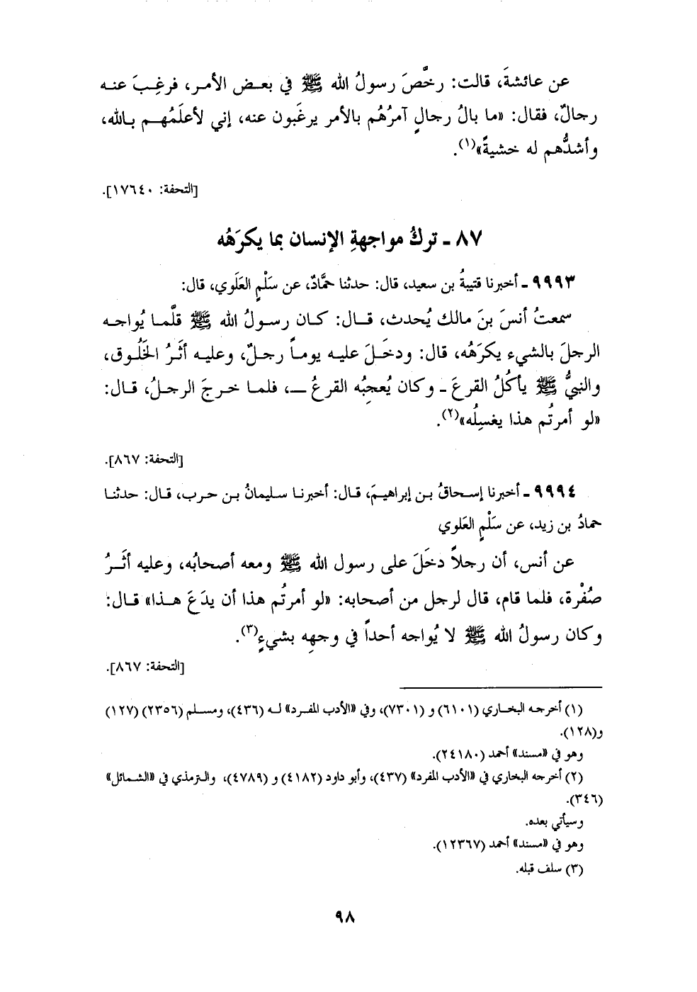 9993 - أَخْبَرَنَا قُتَيْبَةُ بْنُ سَعِيدٍ قَالَ: حَدَّثَنَا حَمَّادٌ، عَنْ سَلْمٍ الْعَلَوِيِّ قَالَ: سَمِعْتُ أَنَسَ بْنَ مَالِكٍ، يُحَدِّثُ قَالَ: كَانَ رَسُولُ اللهِ صَلَّى اللهُ عَلَيْهِ وَسَلَّمَ قَلَّمَا يُوَاجِهُ الرَّجُلَ بِالشَّيْءِ يَكْرَهُهُ قَالَ: وَدَخَلَ عَلَيْهِ يَوْمًا رَجُلٌ وَعَلَيْهِ أَثَرُ الْخَلُوقِ، وَالنَّبِيُّ صَلَّى اللهُ عَلَيْهِ وَسَلَّمَ يَأْكُلُ الْقَرْعَ، وَكَانَ يُعْجِبُهُ الْقَرْعُ، فَلَمَّا خَرَجَ الرَّجُلُ قَالَ: «§لَوْ أَمَرْتُمْ هَذَا يَغْسِلُهُ»