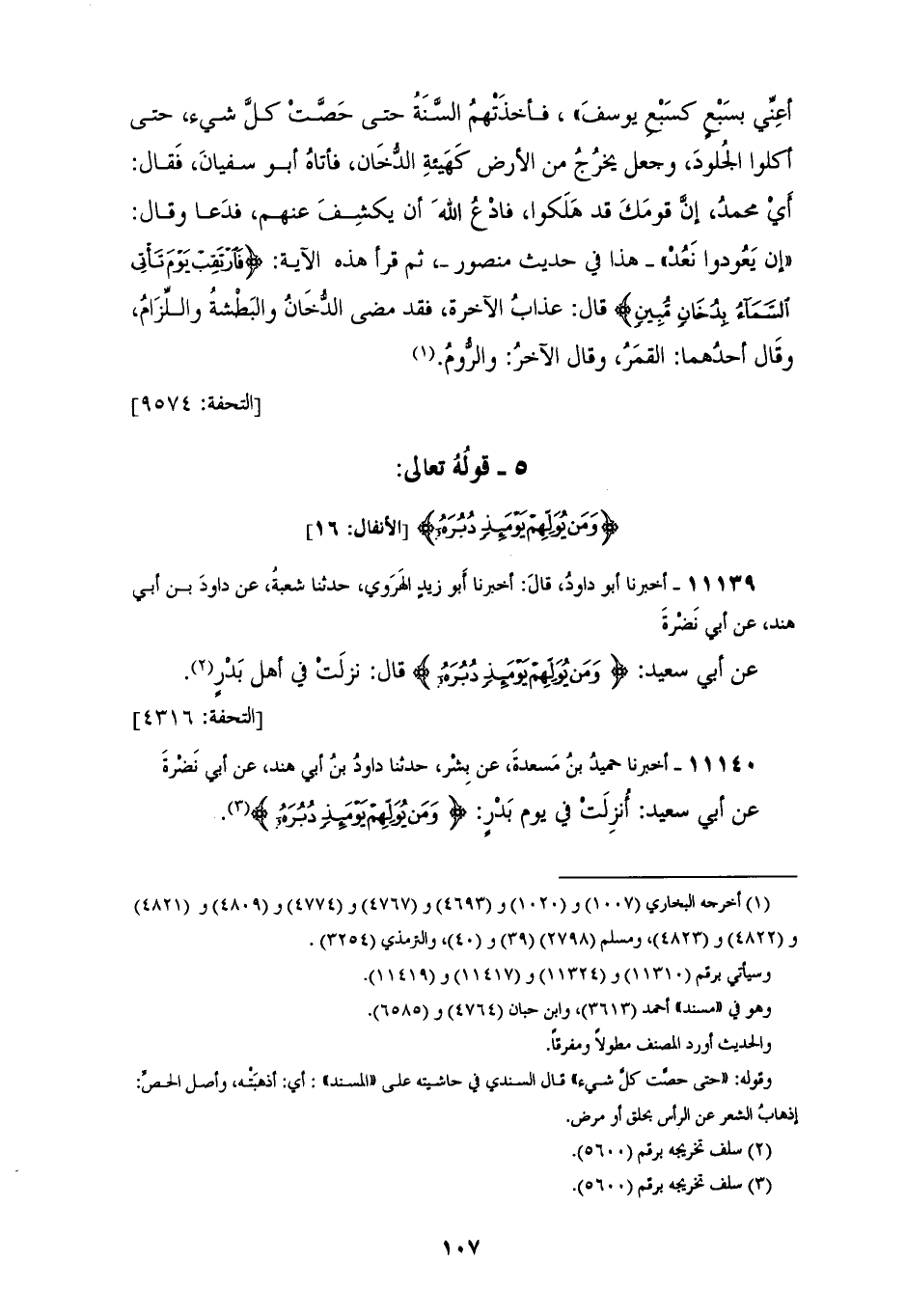 11139 - أَخْبَرَنَا أَبُو دَاوُدَ، قَالَ: أَخْبَرَنَا أَبُو زَيْدٍ الْهَرَوِيُّ، حَدَّثَنَا شُعْبَةُ، عَنْ دَاوُدَ بْنِ أَبِي هِنْدٍ، عَنْ أَبِي نَضْرَةَ، عَنْ أَبِي سَعِيدٍ: {§وَمَنْ يُوَلِّهِمْ يَوْمَئِذٍ دُبُرَهُ} [الأنفال: 16] قَالَ: نَزَلَتْ فِي أَهْلِ بَدْرٍ "