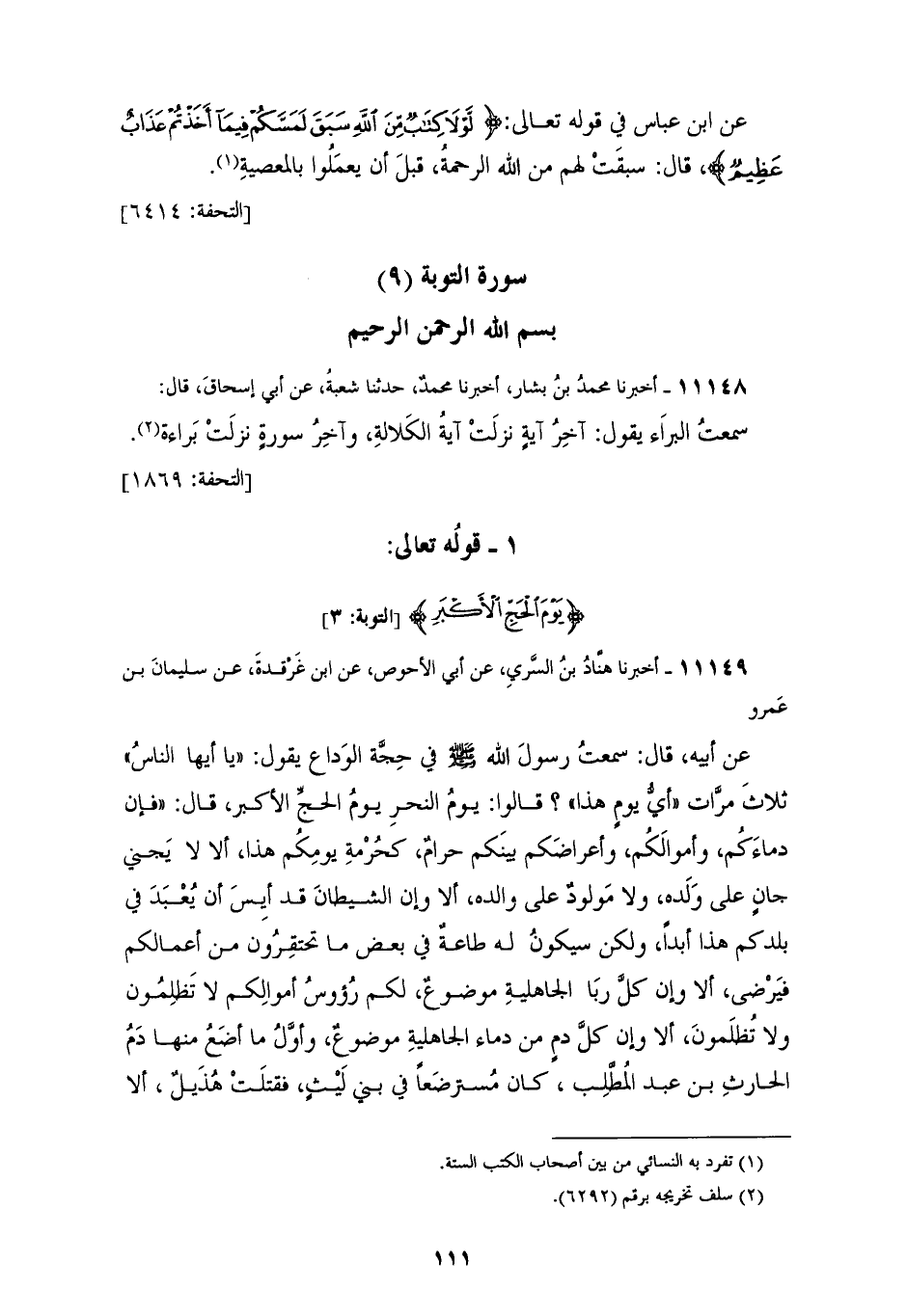 11149 - أَخْبَرَنَا هَنَّادُ بْنُ السَّرِيِّ، عَنْ أَبِي الْأَحْوَصِ، عَنِ ابْنِ غَرْقَدَةَ، عَنْ سُلَيْمَانَ بْنِ عَمْرٍو، عَنْ أَبِيهِ، قَالَ: سَمِعْتُ رَسُولَ اللهِ صَلَّى اللهُ عَلَيْهِ وَسَلَّمَ فِي حَجَّةِ الْوَدَاعِ يَقُولُ: «يَا أَيُّهَا النَّاسُ - ثَلَاثَ مَرَّاتٍ - أَيُّ يَوْمٍ هَذَا؟» قَالُوا: يَوْمُ النَّحْرِ، يَوْمُ الْحَجِّ الْأَكْبَرِ، قَالَ: «فَإِنَّ §دِمَاءَكُمْ، وَأَمْوَالَكُمْ، وَأَعْرَاضَكُمْ، بَيْنَكُمْ حَرَامٌ، كَحُرْمَةِ يَوْمِكُمْ هَذَا، أَلَا لَا يَجْنِي جَانٍ عَلَى وَلَدِهِ، وَلَا مَوْلُودٌ عَلَى وَالِدِهِ، أَلَا وَإِنَّ الشَّيْطَانَ قَدْ أَيِسَ أَنْ يُعْبَدَ فِي بَلَدِكُمْ هَذَا أَبَدًا، وَلَكِنْ سَيَكُونُ لَهُ طَاعَةٌ فِي بَعْضِ مَا تَحْتَقِرُونَ مِنْ أَعْمَالِكُمْ فَيَرْضَى، أَلَا وَإِنَّ كُلَّ رِبَا الْجَاهِلِيَّةِ مَوْضُوعٌ، لَكُمْ رُءُوسُ أَمْوَالِكُمْ، لَا تَظْلِمُونَ وَلَا تُظْلَمُونَ، أَلَا وَإِنَّ كُلَّ دَمٍ مِنْ دِمَاءِ الْجَاهِلِيَّةِ مَوْضُوعٌ، وَأَوَّلُ مَا أَضَعُ مِنْهَا دَمُ الْحَارِثِ بْنِ عَبْدِ الْمُطَّلِبِ» كَانَ مُسْتَرْضَعًا فِي بَنِي لَيْثٍ فَقَتَلَتْهُ هُذَيْلٌ «أَلَا يَا أُمَّتَاهُ هَلْ بَلَّغْتُ؟» ثَلَاثَ مَرَّاتٍ، قَالُوا: نَعَمْ، قَالَ: «اللهُمَّ اشْهَدْ»