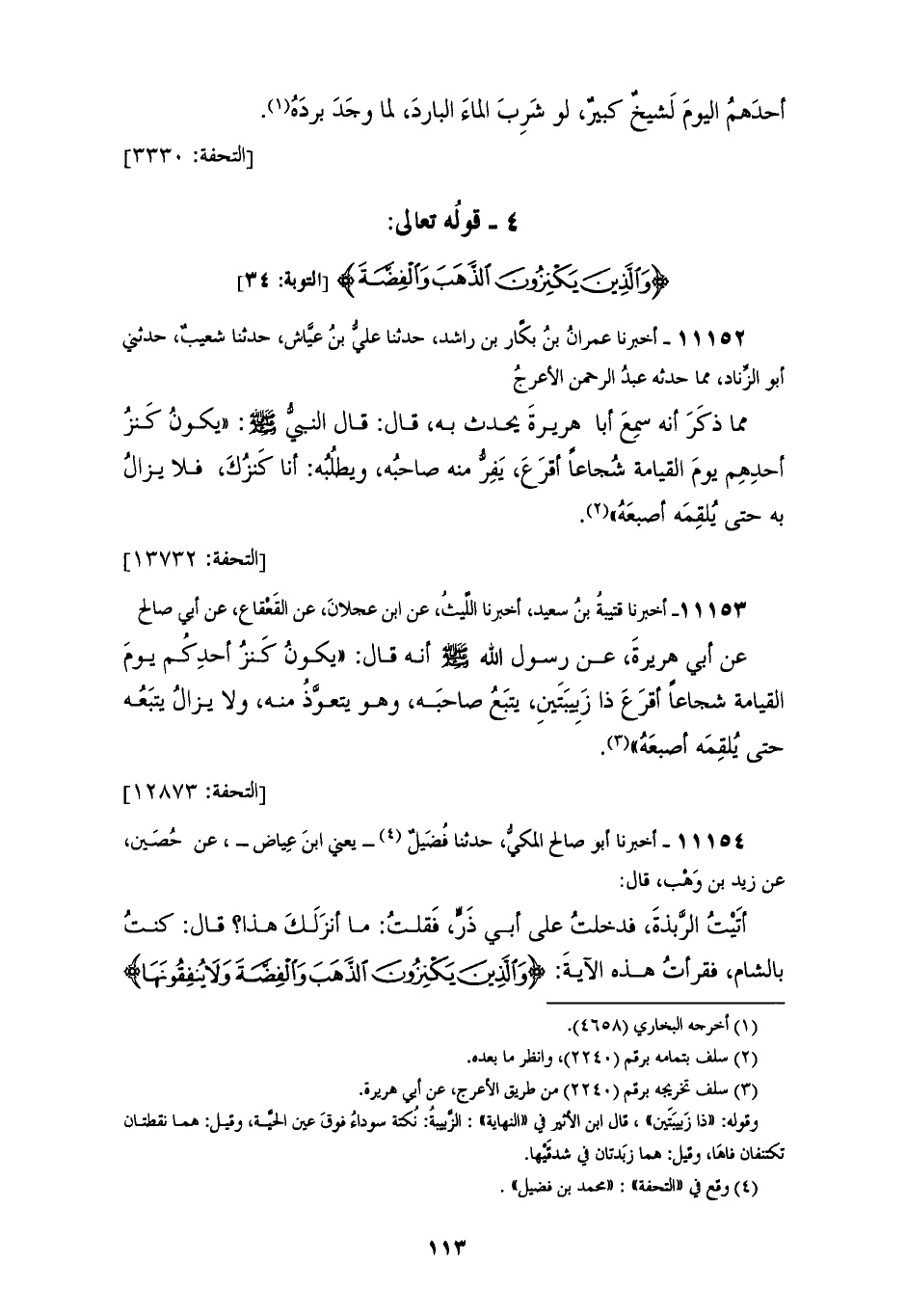 11152 - أَخْبَرَنَا عِمْرَانُ بْنُ بَكَّارِ بْنِ رَاشِدٍ، حَدَّثَنَا عَلِيُّ بْنُ عَيَّاشٍ، حَدَّثَنَا شُعَيْبٌ، حَدَّثَنِي أَبُو الزِّنَادِ، مِمَّا حَدَّثَهُ عَبْدُ الرَّحْمَنِ الْأَعْرَجُ، مِمَّا ذَكَرَ أَنَّهُ سَمِعَ أَبَا هُرَيْرَةَ يُحَدِّثُ بِهِ قَالَ: قَالَ النَّبِيُّ صَلَّى اللهُ عَلَيْهِ وَسَلَّمَ: «يَكُونُ §كَنْزُ أَحَدِهِمْ يَوْمَ الْقِيَامَةِ شُجَاعًا أَقْرَعَ، يَفِرُّ مِنْهُ صَاحِبُهُ، وَيَطْلُبُهُ أَنَا كَنْزُكَ، فَلَا يَزَالُ بِهِ حَتَّى يُلْقِمَهُ أُصْبُعَهُ»